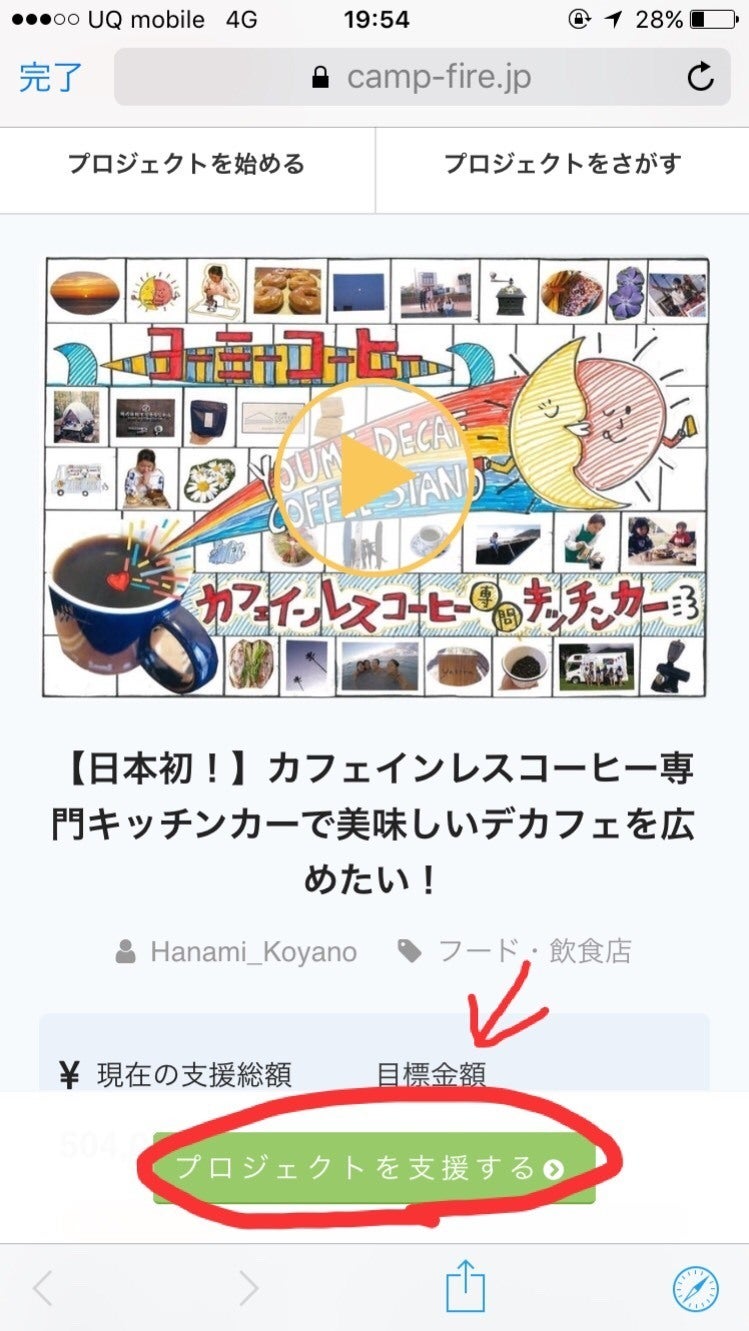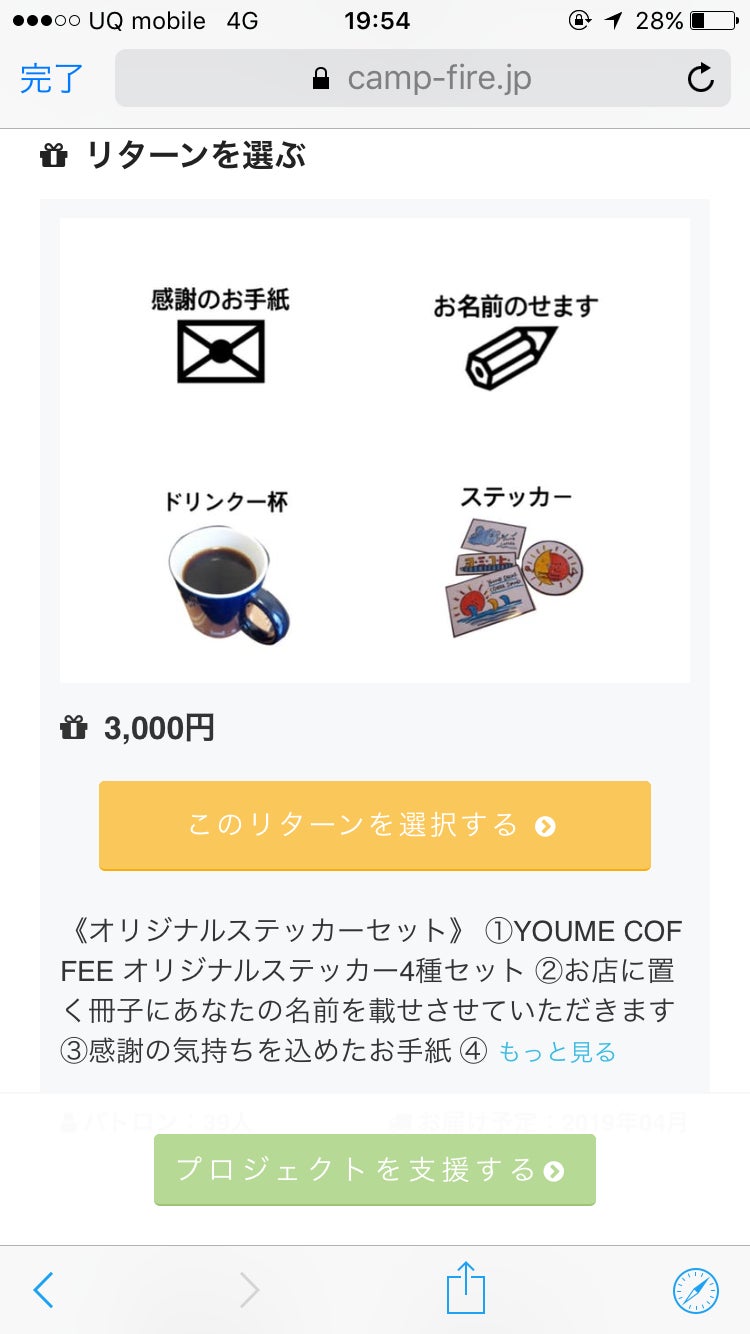 ①「YOUME DECAF COFFEE STAND」のプロジェクトページから「プロジェクトを支援する」をおし、リターンを選択します。(まだ登録が済んでいない方はこの時点ではご希望のリターンでなくても大丈夫です!後で登録完了後に再度リターンを選択頂きます。)