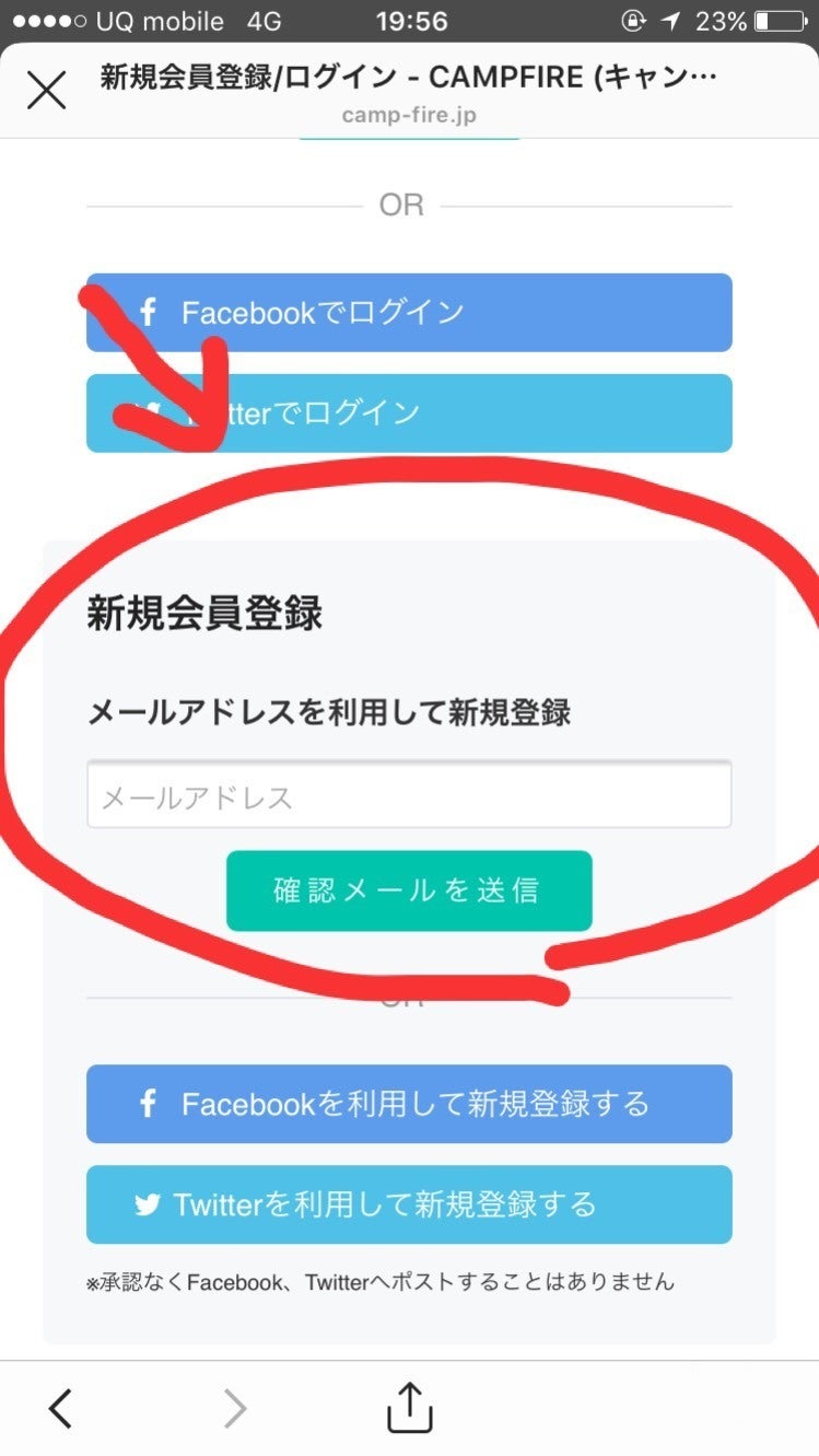 ②「新規登録」からメールアドレスを入力。(FacebookやTwitterからでも可能ですが、どちらにしろメールアドレスとパスワードなどを入力する事になるので労力は変わらないと思います!)