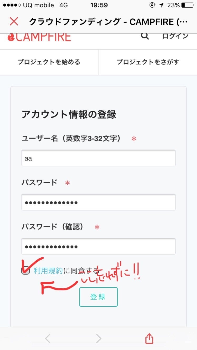⑤ユーザー名、パスワードを入力し、「利用規約に同意する」にチェックを入れて登録をおす。
