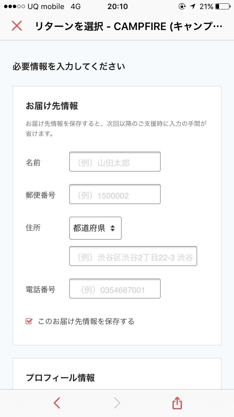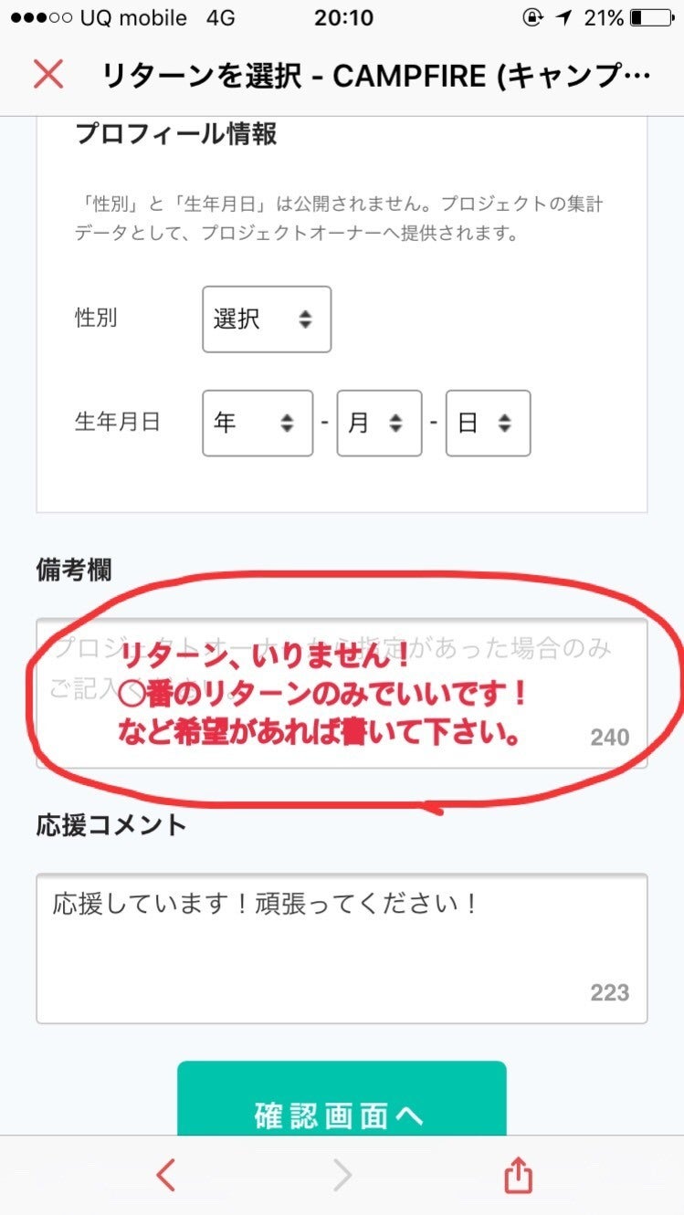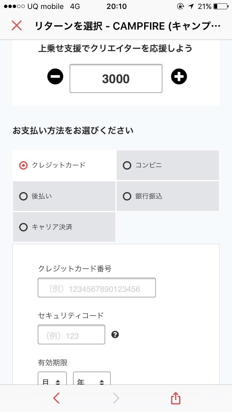 ⑧リターンを選択後、クレジットカード支払い・コンビニ支払いなどの支払い方法を選択。⇒お名前・住所・誕生日などを入力後「確認画面へ」をおして完了です!