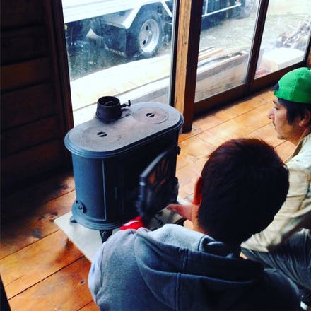 店長さんからストーブの使い方を教えてもらってます(^^♪