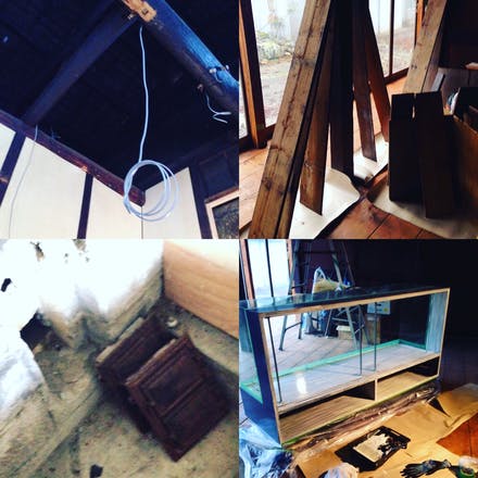 古材やら棚やら壁に色も塗っております。店舗内が柿渋臭いです(笑)