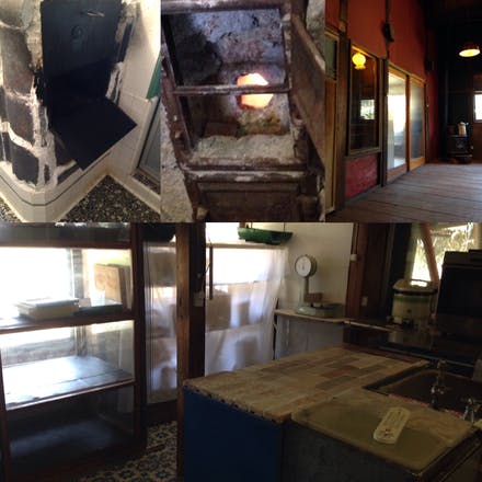 画像、左上はパン窯ですが元お風呂をそのまま使い瓦で出来ております。
