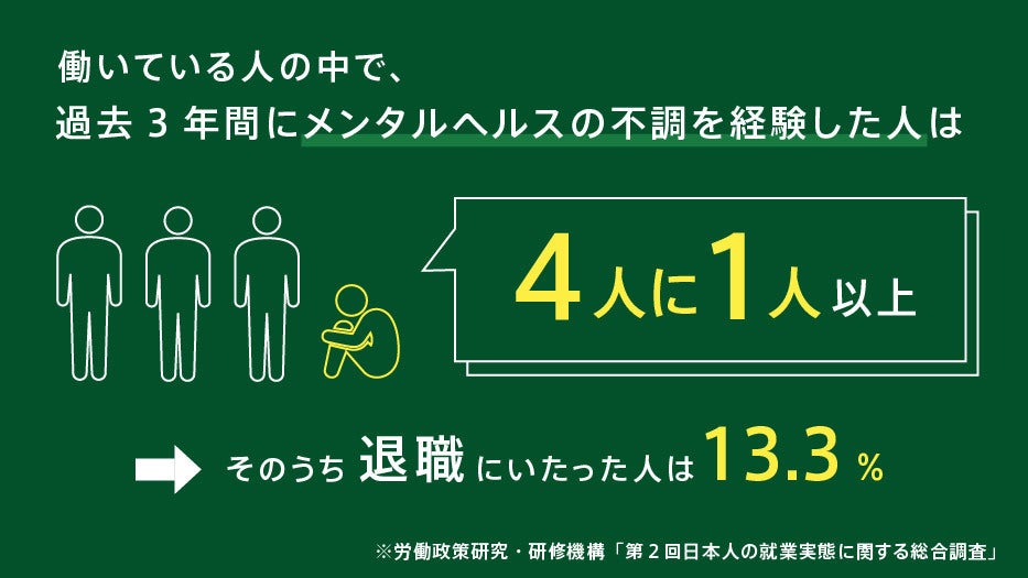 近年うつ病の患者数がおよそ100万人の規模にまで増加するなか、2014年に実施されたある調査(※)によれば、働いている人の中で過去3年間にメンタルヘルスの不調を経験した人は4人に1人以上(25%以上)と言われています。また、メンタルヘルスの不調から退職にいたった人はそのうちの13.3%にのぼるという結果も出ています。