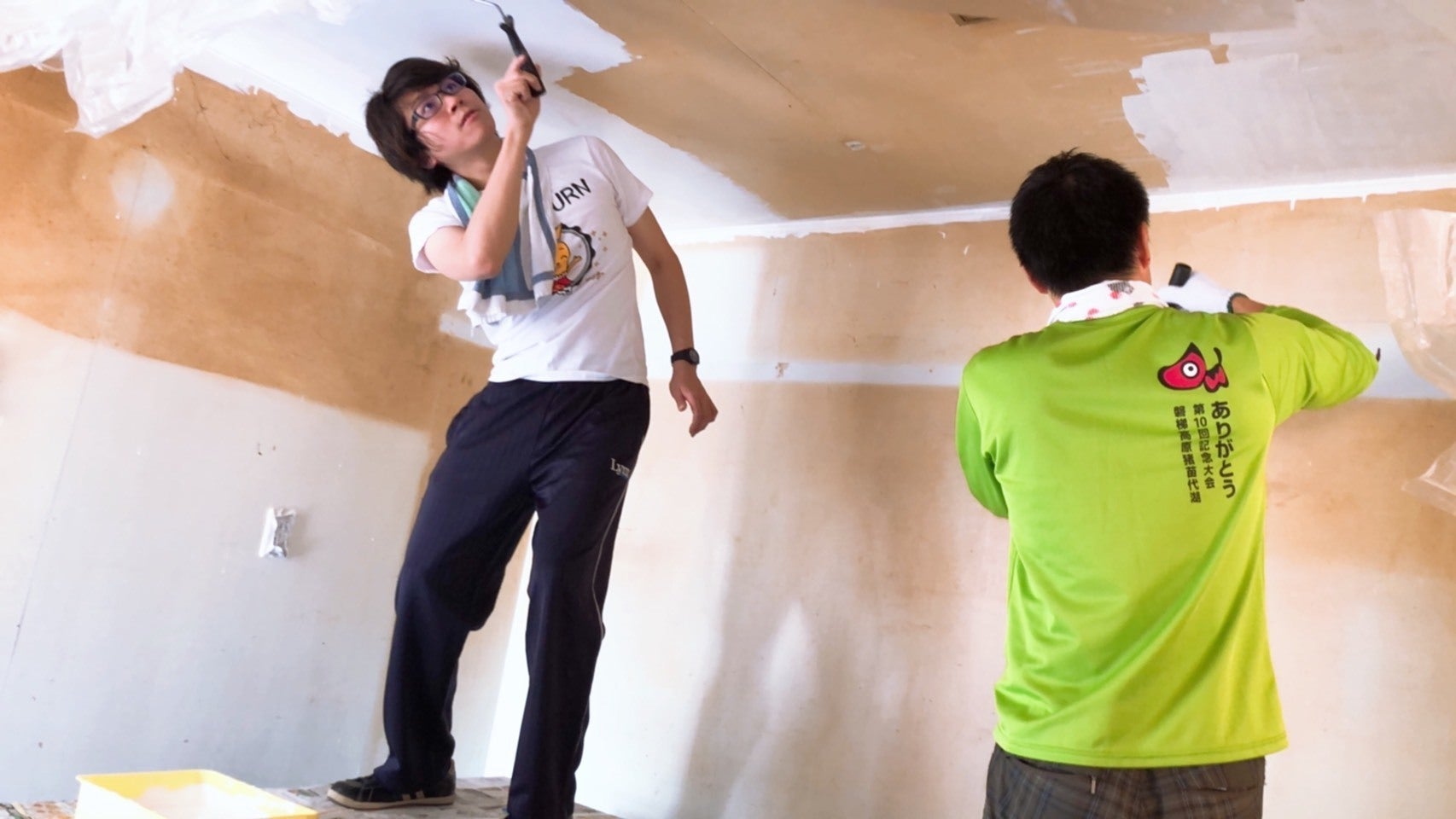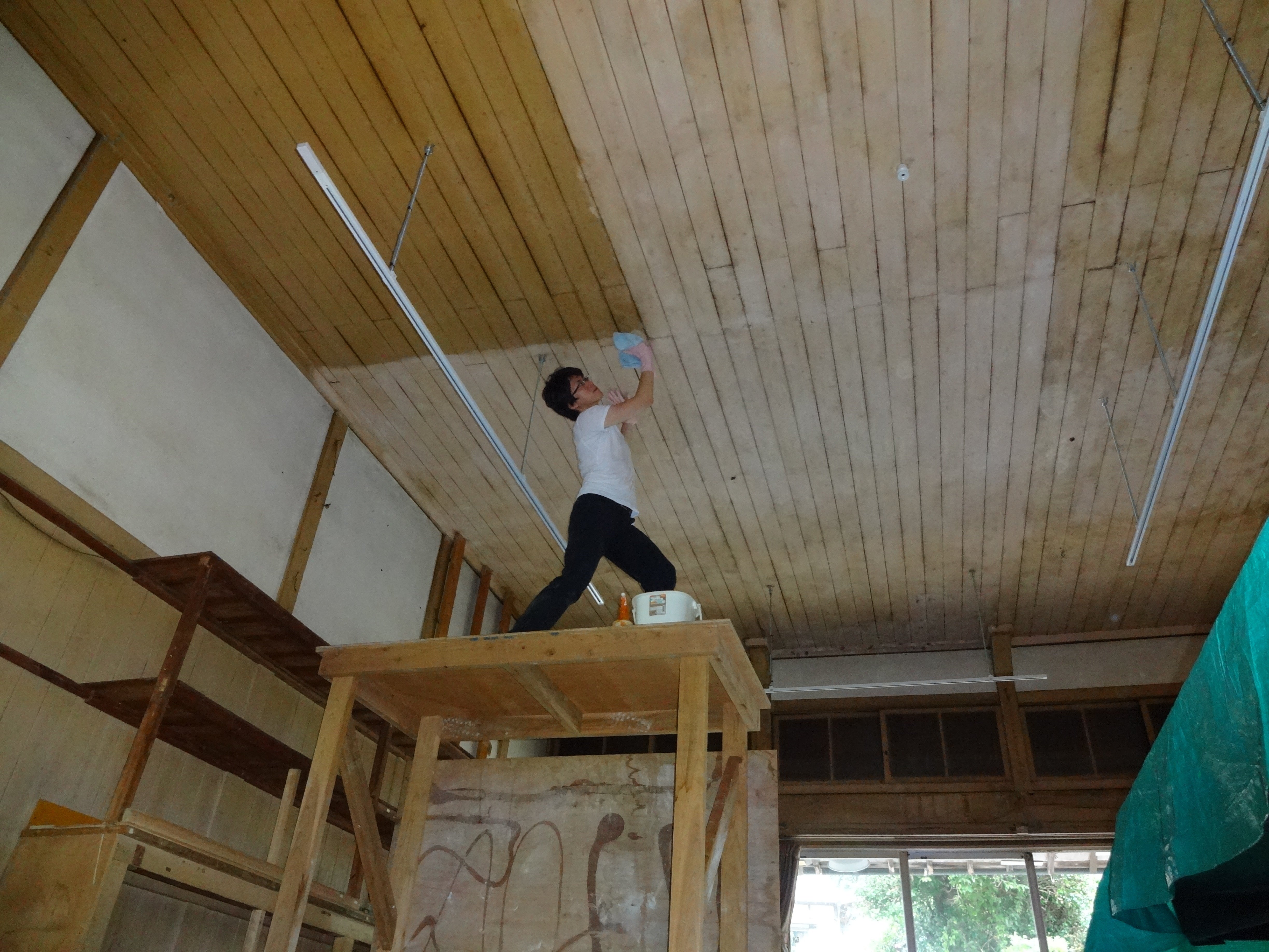 ↑ 天井&壁塗り。シンプルだが意外と難しい。空調の導入前で、汗だくで作業。