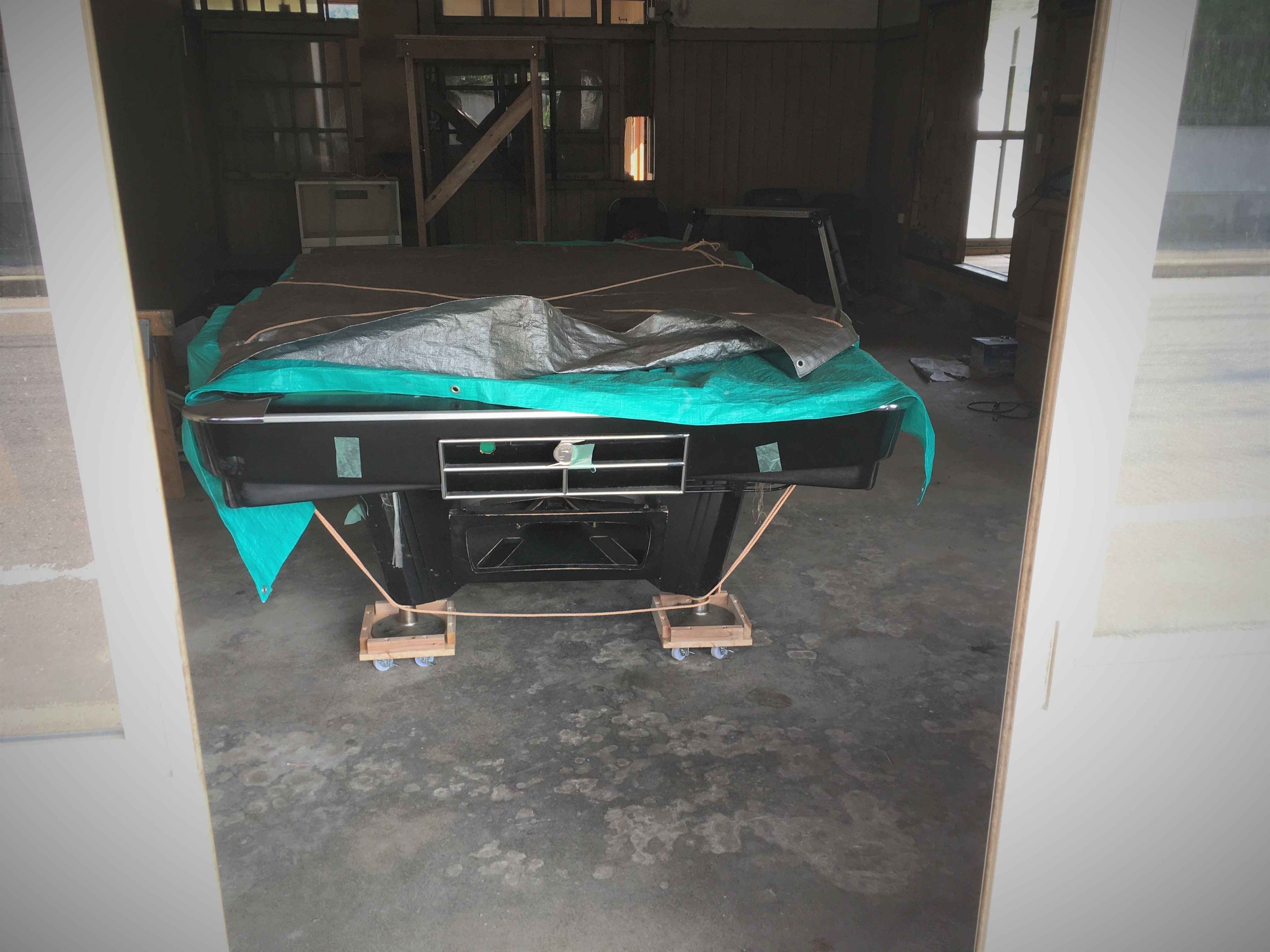 ↑ 中古ビリヤード台の運搬。格安で譲り受け、台座ローラーを設計・加工し、建物内に運び入れました!