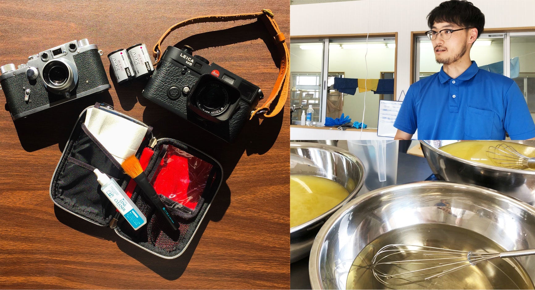 左:蔵CURAブランドのカメラクリーニングキット 右:絹手練りせっけんの生産をする毒島様と調合の様子