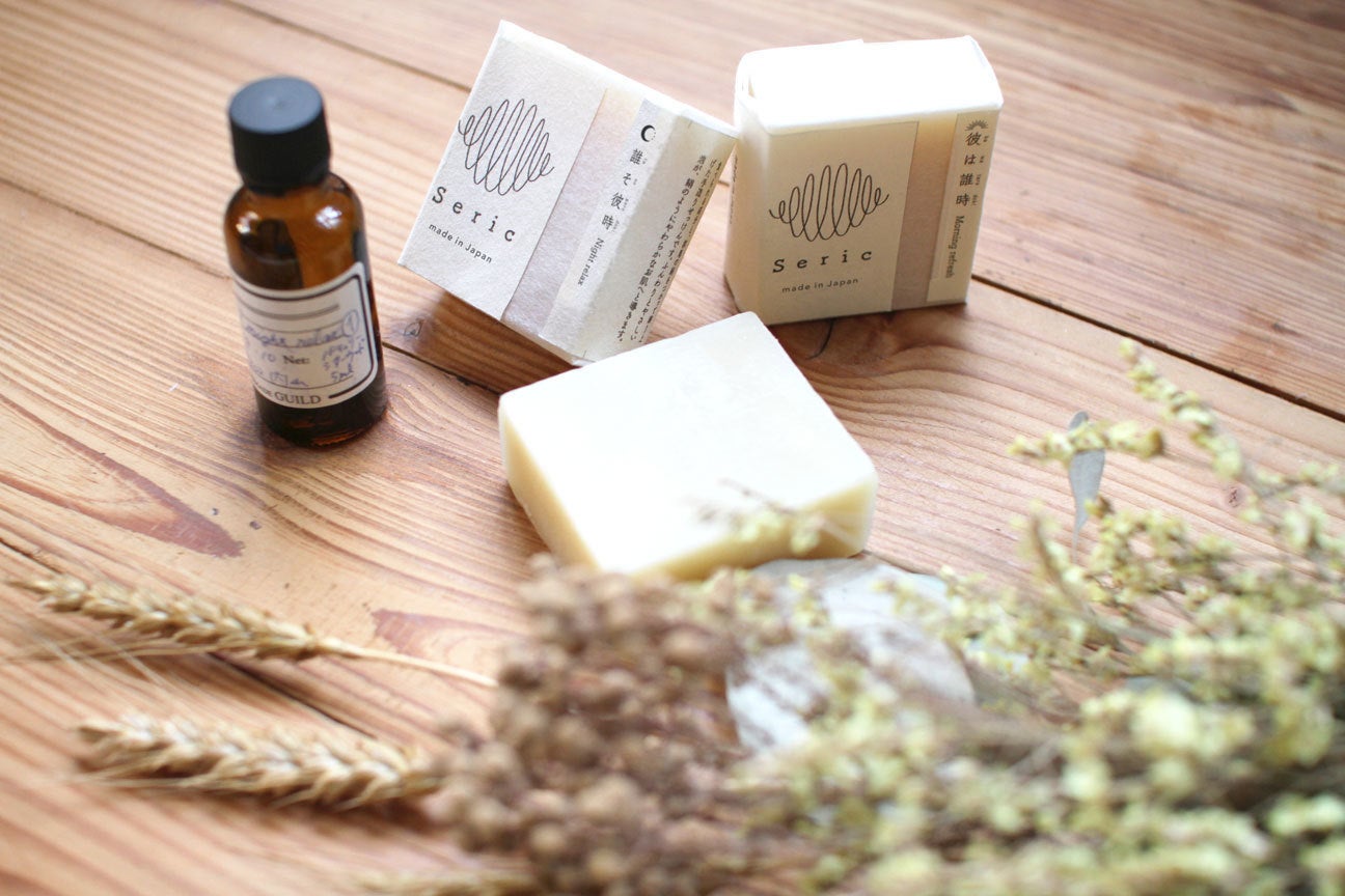 オリジナルブレンド「彼は誰時(Morning refresh)」と「誰そ彼時 Night relax」という2種類のエッセンシャルオイルはSericのオーガニック由来石鹸用に1からデザインして頂き、バスタイムにほのかに香るそれぞれの時間に合わせた香りを楽しんで頂けるようにしました。