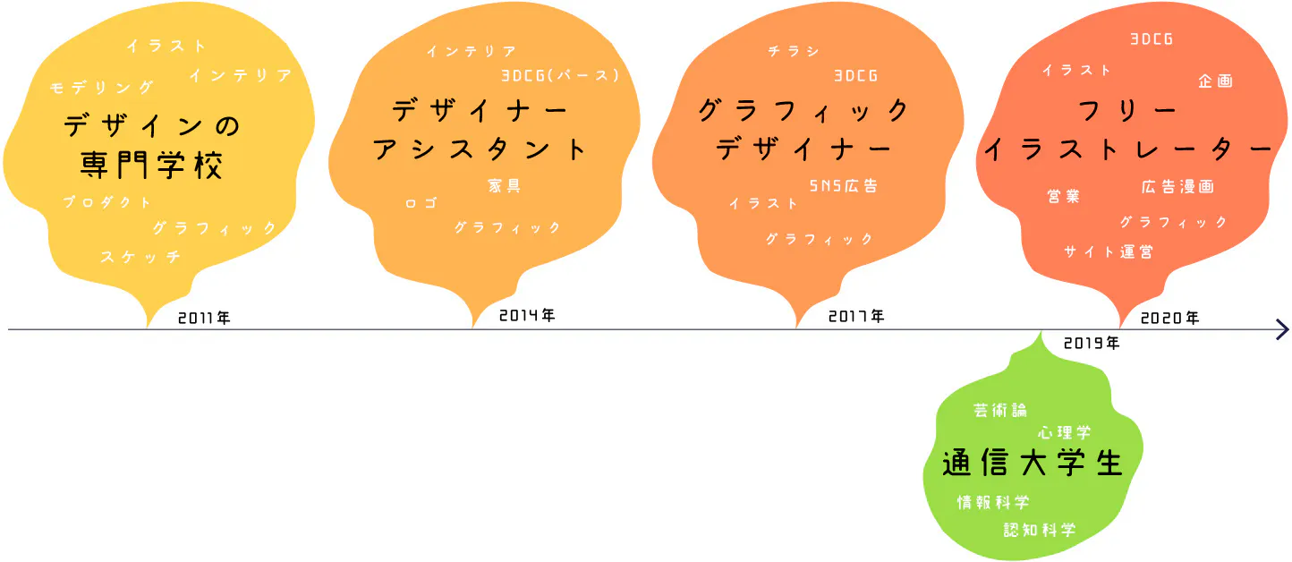 2014年にデザイン系の専門学校を卒業しました。デザイン事務所でデザイナーアシスタントとして3年間勤務しした。その後は転職し、一般企業でグラフィックデザイナーとして働きましたが、デザインや絵の価値について疑問を持ち始めて、通信大学で様々な分野の視点から芸術の価値を追求する。その後、グラフィックデザインではできない、イラストの幅広い表現手法に刺激を受けて、イラストレーターになることを決意しました。