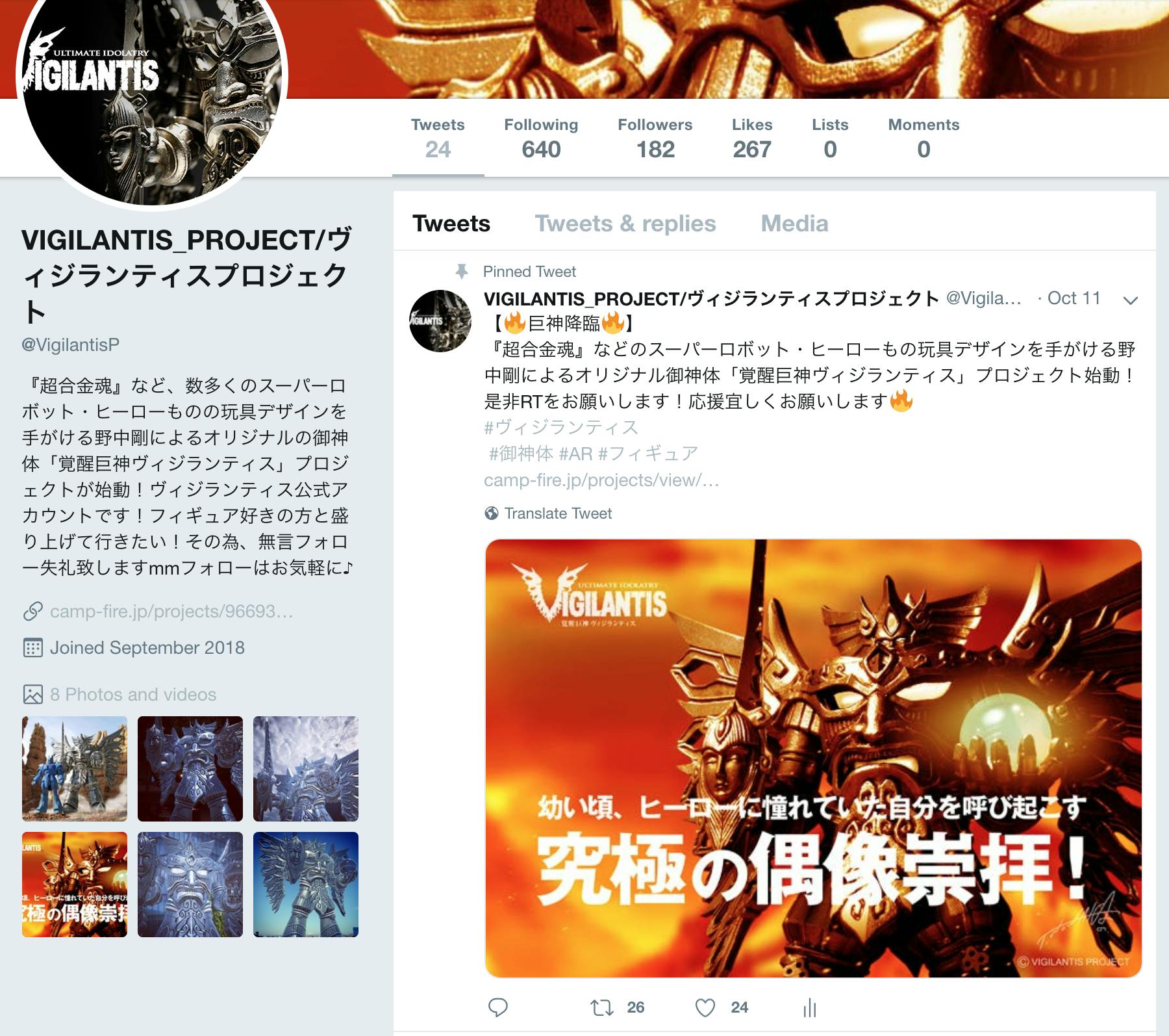 2018/10/20 00:18現在、このプロジェクトを知っていただきたく、Twitter、インスタグラム、Facebookに、ARを利用して撮影をした画像や、野中氏による「巨神の出会いシリーズ」などを投稿し、草の根的に拡散を続けております。 Twitterでは、フォロワーさんが182名となり、フォロワーさん200名まであと一息!少しでも興味を持っていただけることが嬉しく、フォロワーの皆さんの投稿をみながら、みなさんのロボットや玩具への想いの強さをかいま見たり、学んだりしています! 実際、Twitterで情報を見てご支援いただいた方もいらっしゃり、少しずつですがこのプロジェクトを知っていただけていること、ご支援いただいていることに感謝しています。 今後は、試作品ヴィジランティスの撮影画像なども掲載していきますので、SNSでの発信をお楽しみいただけたら嬉しいです! 今日のヴィジランディス(ARヴィジランティス登場プロジェクト)では、登場する場所を探していますので、ヴィジランティスにぴったりな場所などありましたら、是非お教えください★ まだまだ、認知度が低く、残りの公開日数で、少しでもこのプロジェクトを多くの皆様に知っていただけるよう活動をしていきますので、引き続きよろしくお願いします! もっと見る
