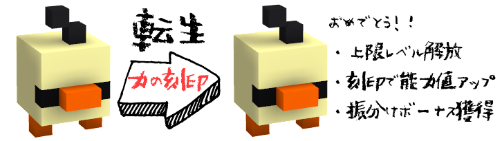 転生する事で、ずさもんの上限レベルを解放する事が出来、転生した際のレベルに応じて、能力値振り分けボーナスポイントを獲得する事が出来ます。