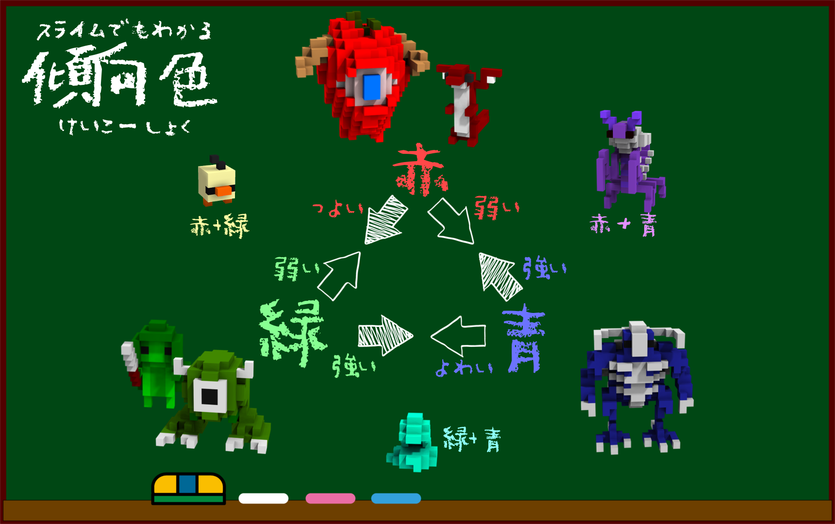 「赤は炎」、「緑は自然」、「青は冷気」を示します。