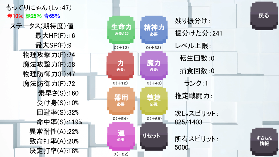 このポイントは自由に能力値に振り分けて、ずさもんを自分好みに自由強化する事が可能です。