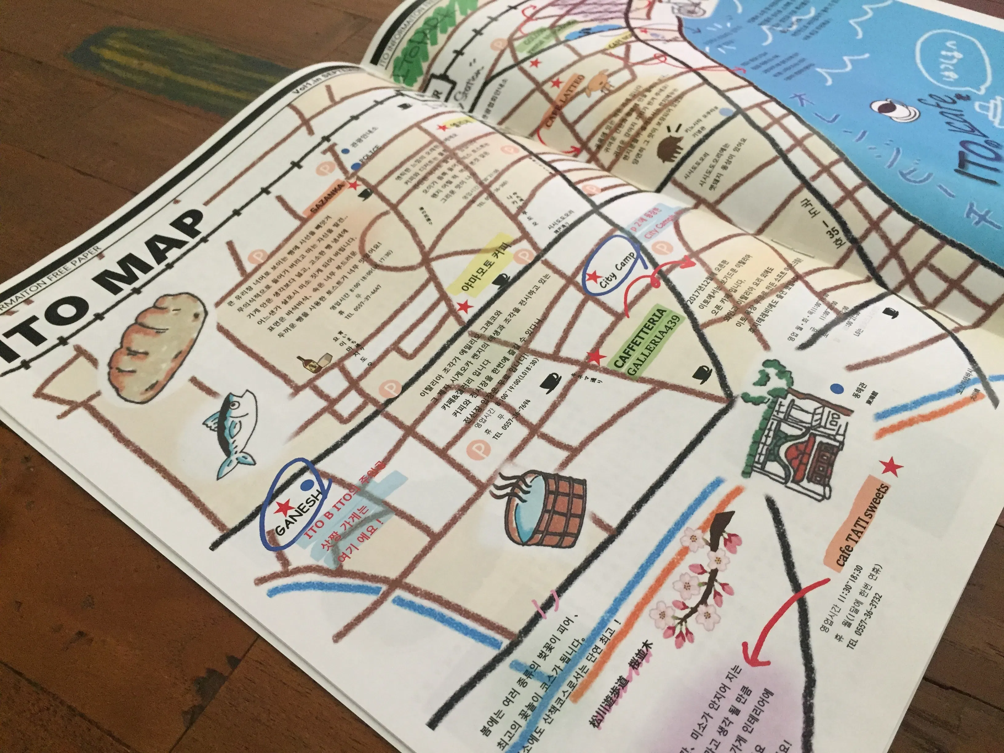 ☝韓国語版の中身はこんなかんじ。MAPも韓国語でわかりやすく!現在、韓国の学校や飲食店と、一部、日本国内でも配布しております。