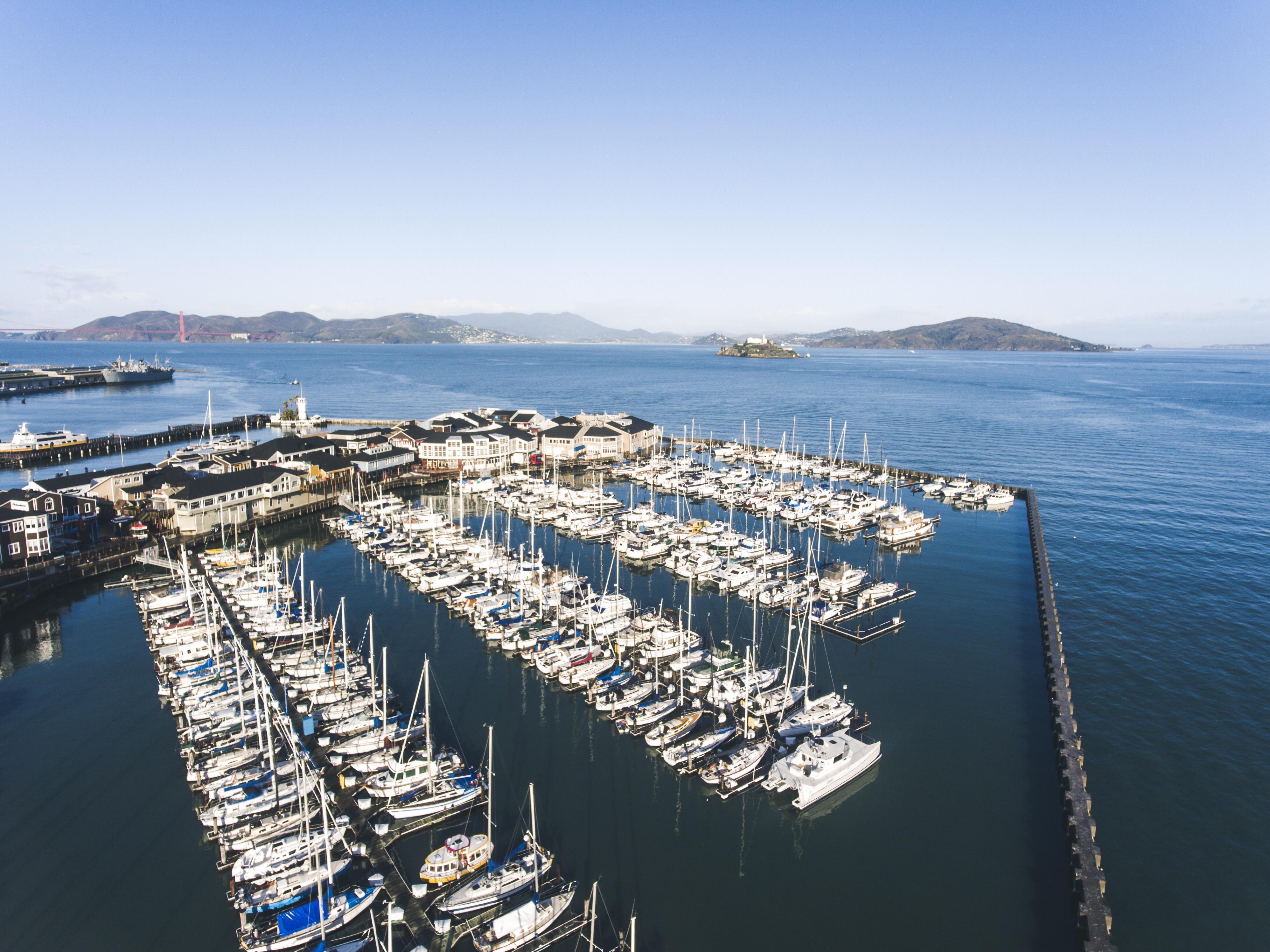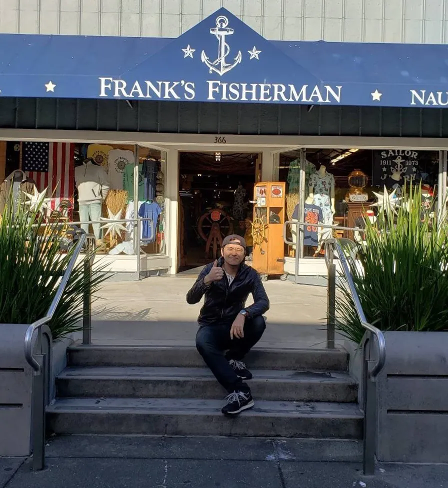 ☝アメリカのサンフランシスコ・フィッシャーマンズワーフ。海の向こうには、観光名所(ゴールデンゲートブリッジ及びアルカトラズ島)を一望できます。