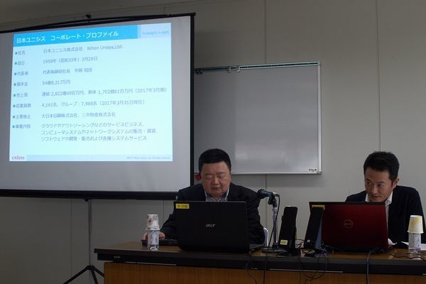 札幌で開催された視覚障害者就労促進フォーラムで発表する視覚障害者(左)と上司の方