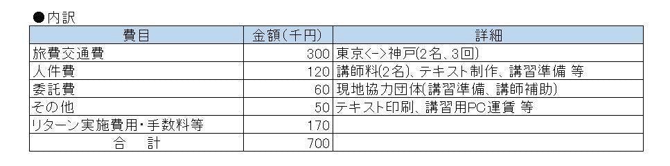 今回支援頂いた金額は、SPANから講師として参加するメンバーの講師料・旅費交通費、現地の協力団体への委託費、講習テキストの作成・印刷・配送費、講習で使用するPCの送料などに使わせて頂きます。内訳は下記の表をごらんください。70万円で、3回(2日/回)の職業講習を開催し、計30人の視覚障害者に受講していただこうと計画しています。