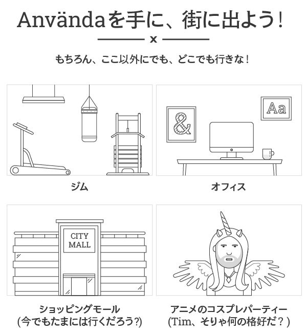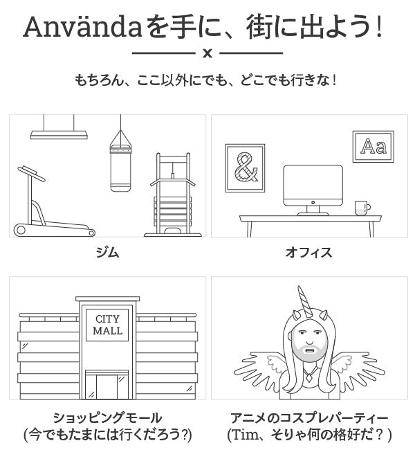「Använda」は「使う」という意味のスウェーデン語。僕たちの会社はスウェーデンにあるんだ。めちゃめちゃクールな国だからぜひ来てみてほしい。もちろんオフィスはNGで。