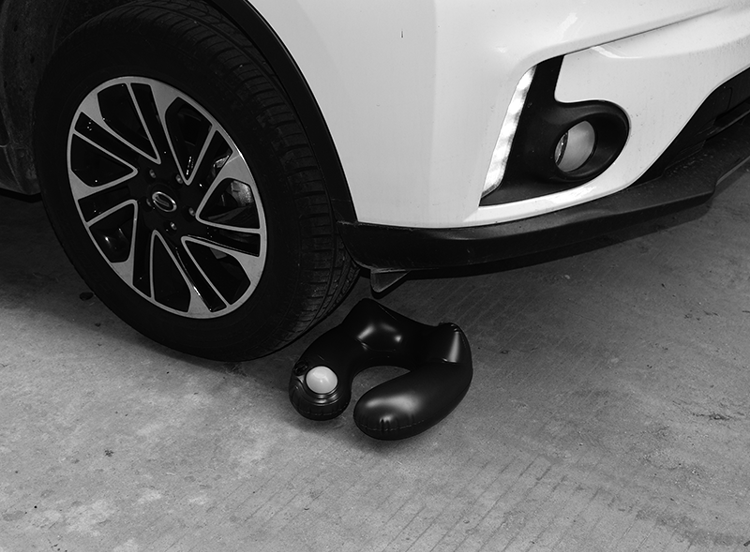 上の画像のように、製品耐久テストでは車が乗っても破裂しないほどです。