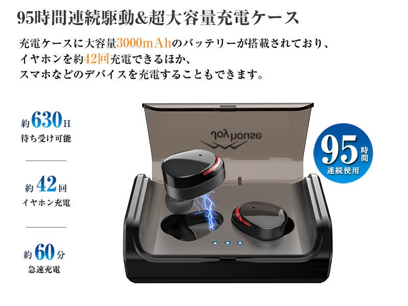 ▼3000mAh大容量充電ケース&95時間連続駆動