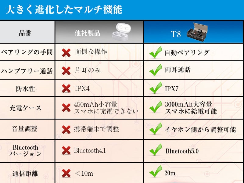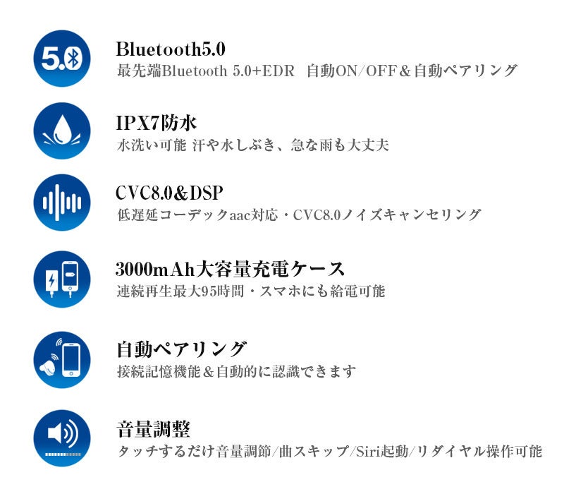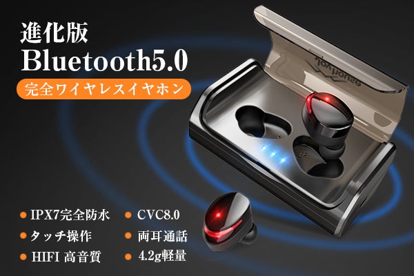 こちらのBluetooth イヤホンは他社の製品より、最新のbluetooth5.0を採用するので、通信距離が20mになり、IPX7防水技術により、水の侵入を防ぐ、水洗い、汗や水しぶき、急な雨などからイヤホンを守ります。また、自動ペア、両耳通話、音量調整もでき、便利です。充電ケースは3000mAhでイヤホンを約42回フル充電できます。モバイルバッテリーとしてスマホに充電も実現できます。