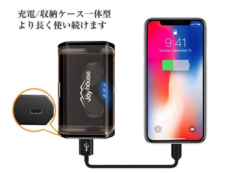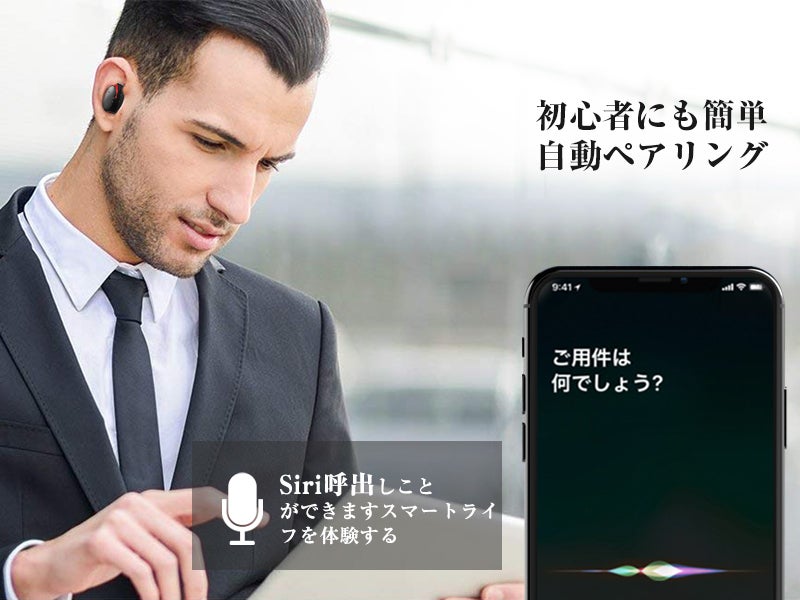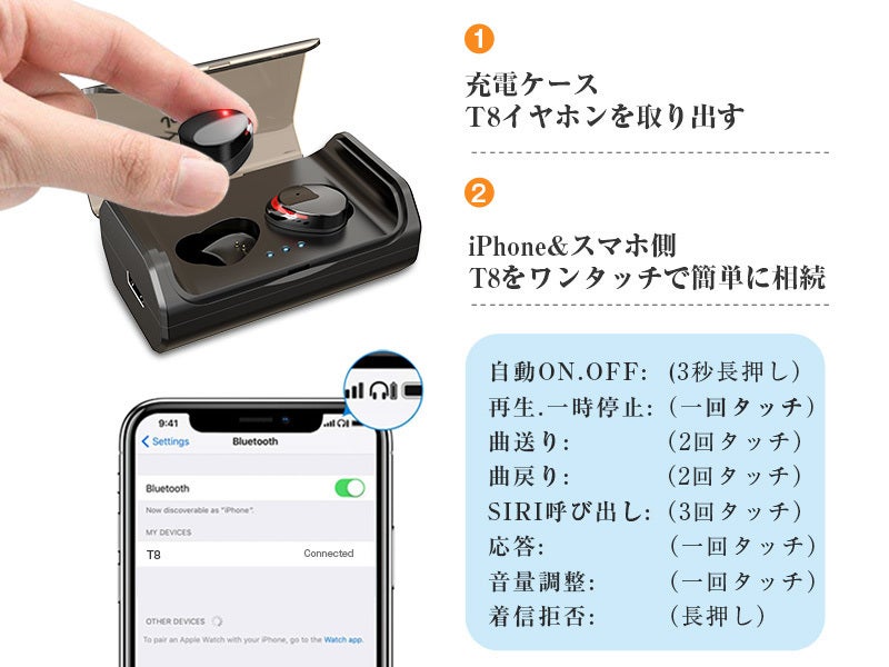 イヤホンを充電ケースから取り出し、最初一回のペアリング操作だけですぐに使え、複雑な操作が不要、一々ボタン押し接続の手間を省けます。記憶機能もあり次回は検索しなくても簡単に接続できます。尚、電源切れ防止に、イヤホン本体のバッテリー残量がスマホの画面に表示され、残量を一目で確認できます。また、イヤホンを3回タッチでsiriを呼び出します。