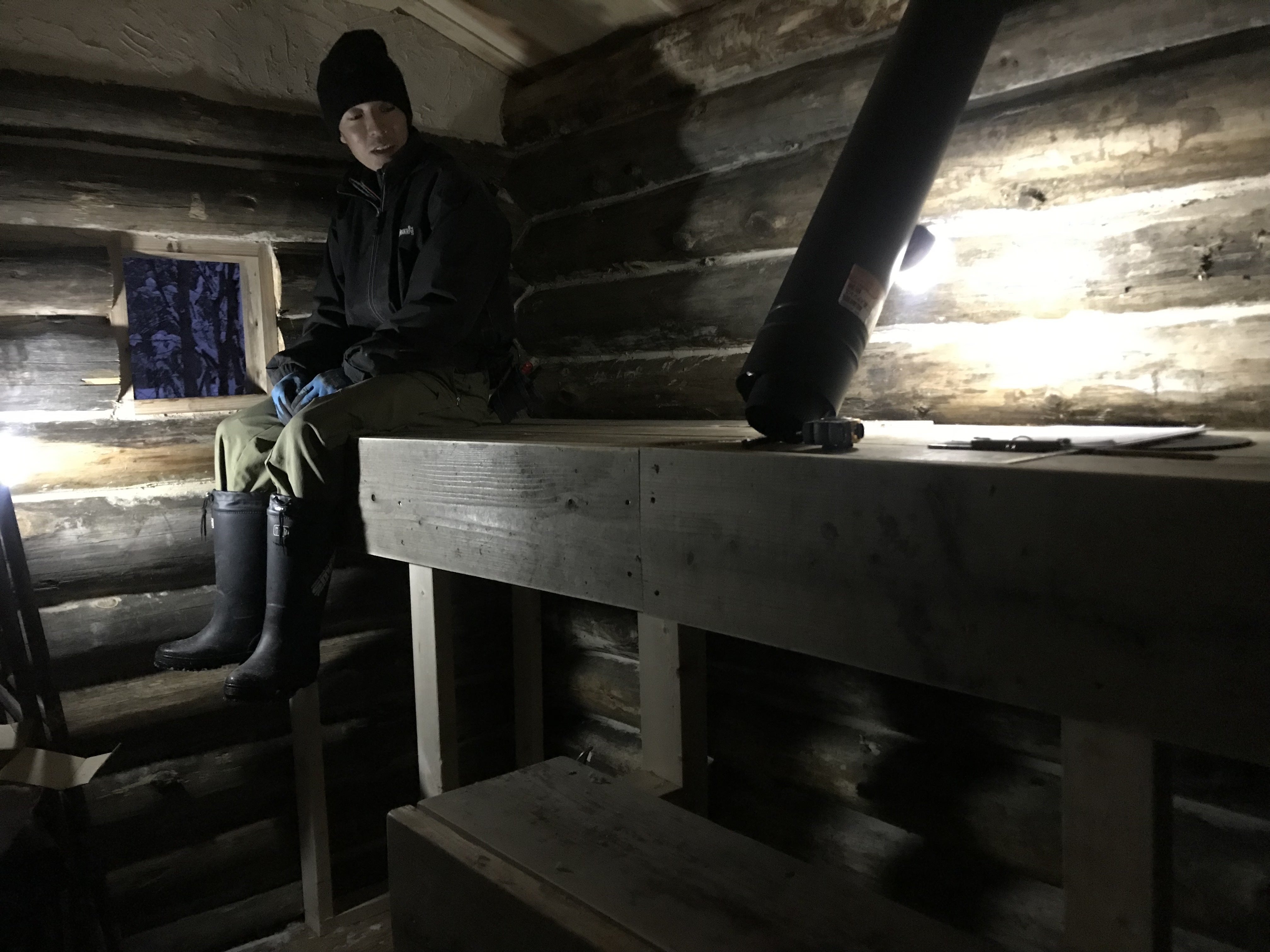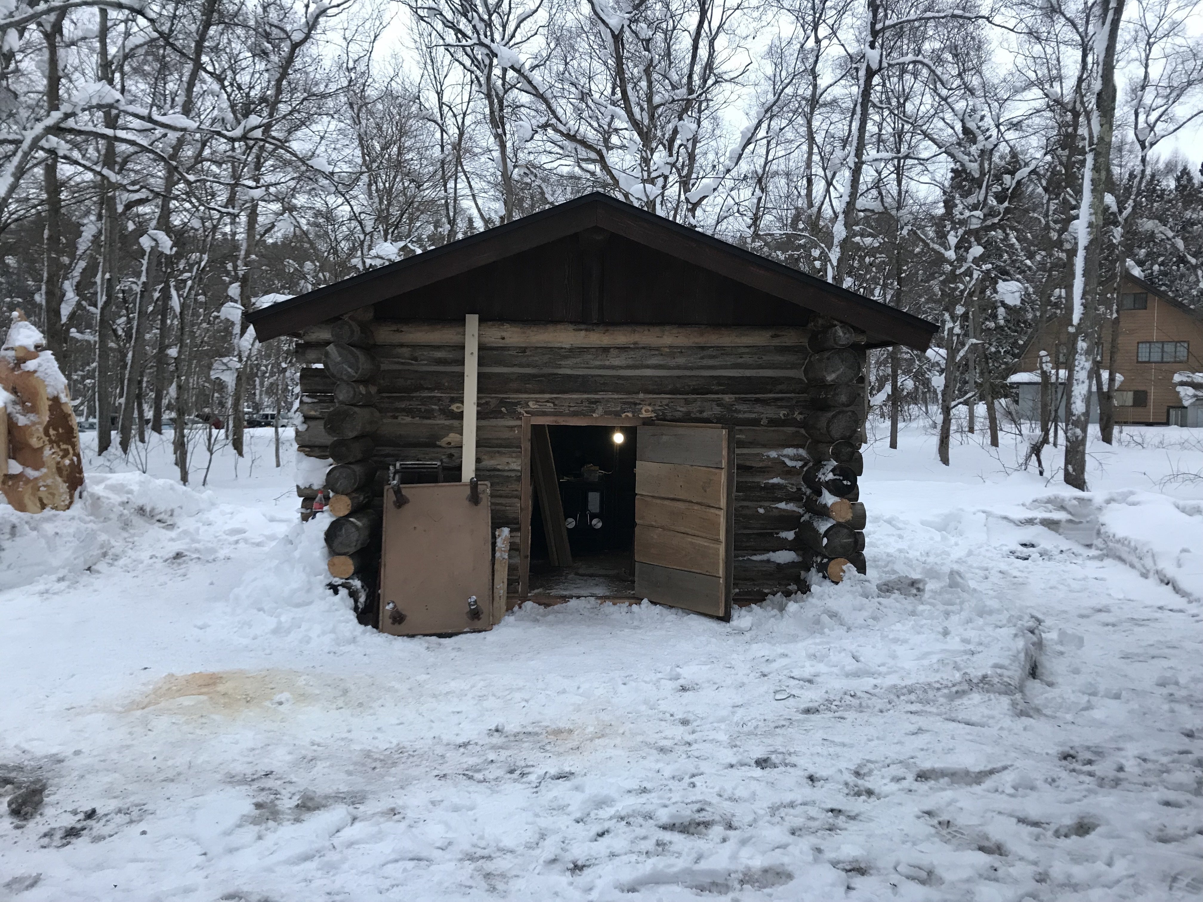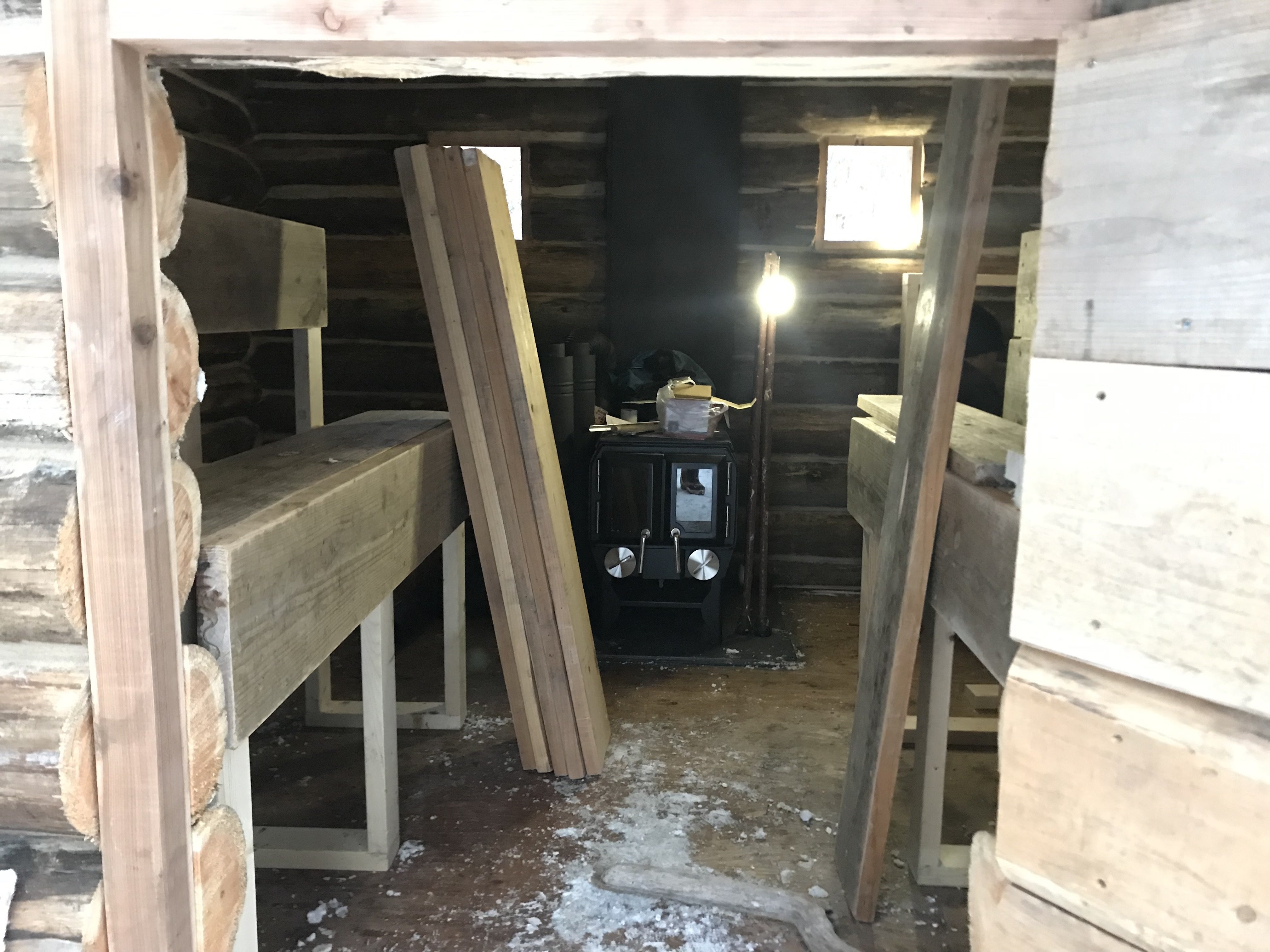 小屋の扉を開けると、中にはストーブとベンチ……。もう、これ目を瞑れば汗をかけるんじゃないですかね。