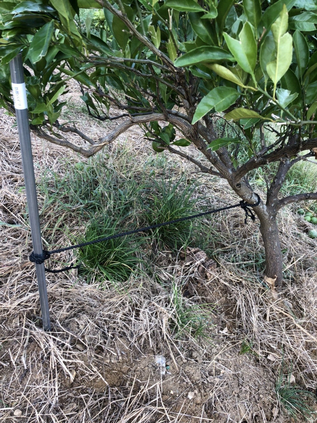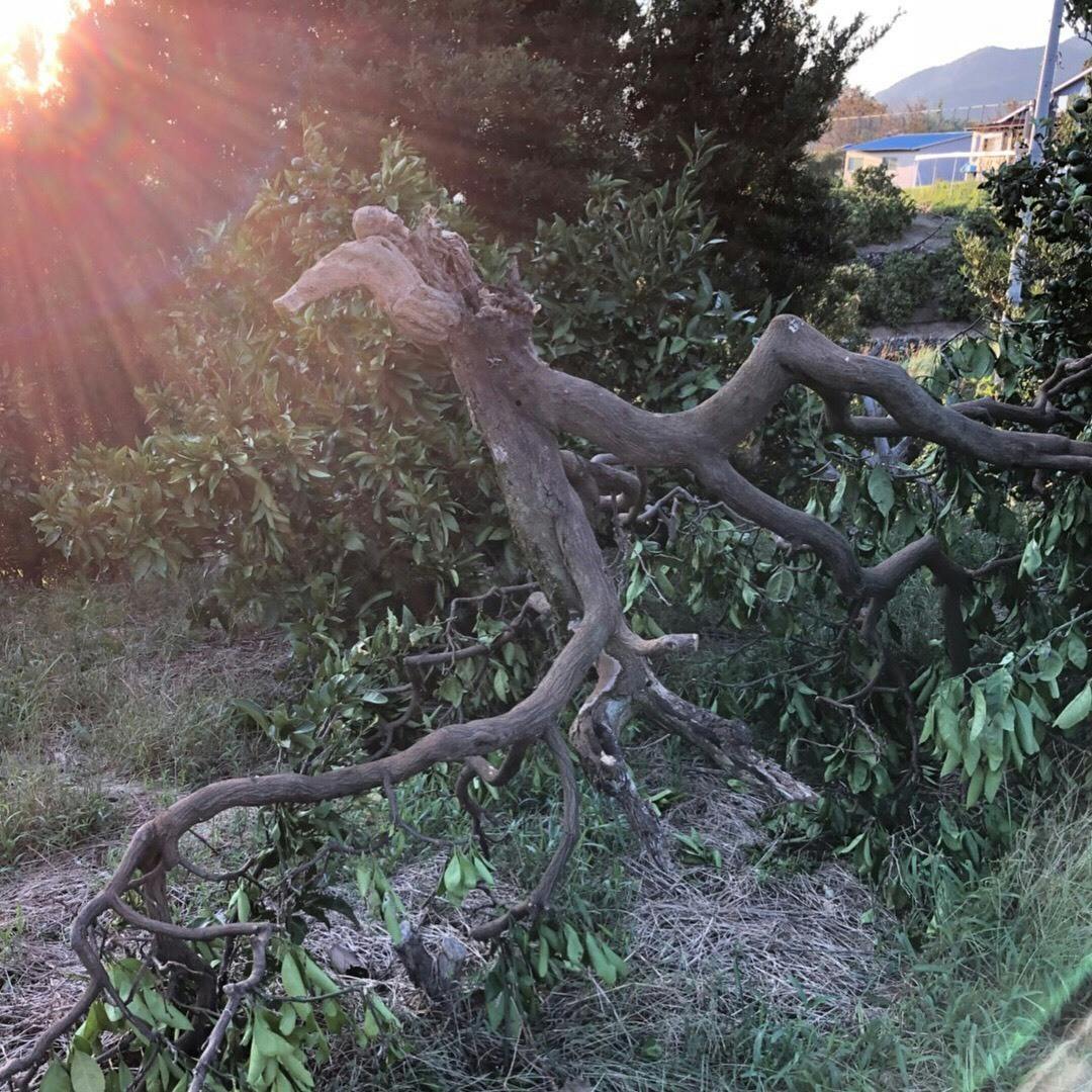 半数以上のみかんの木が根から掘り起こされたようになぎ倒され、なぎ倒された木元に戻して支えておくために、みかんの木、一本一本に鉄パイプや強度の強いロープが早急に必要です!