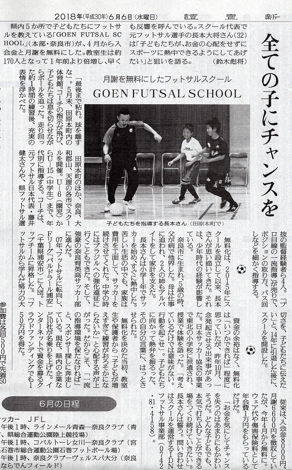 今年の4月から月謝無料のフットサルスクールを初め、