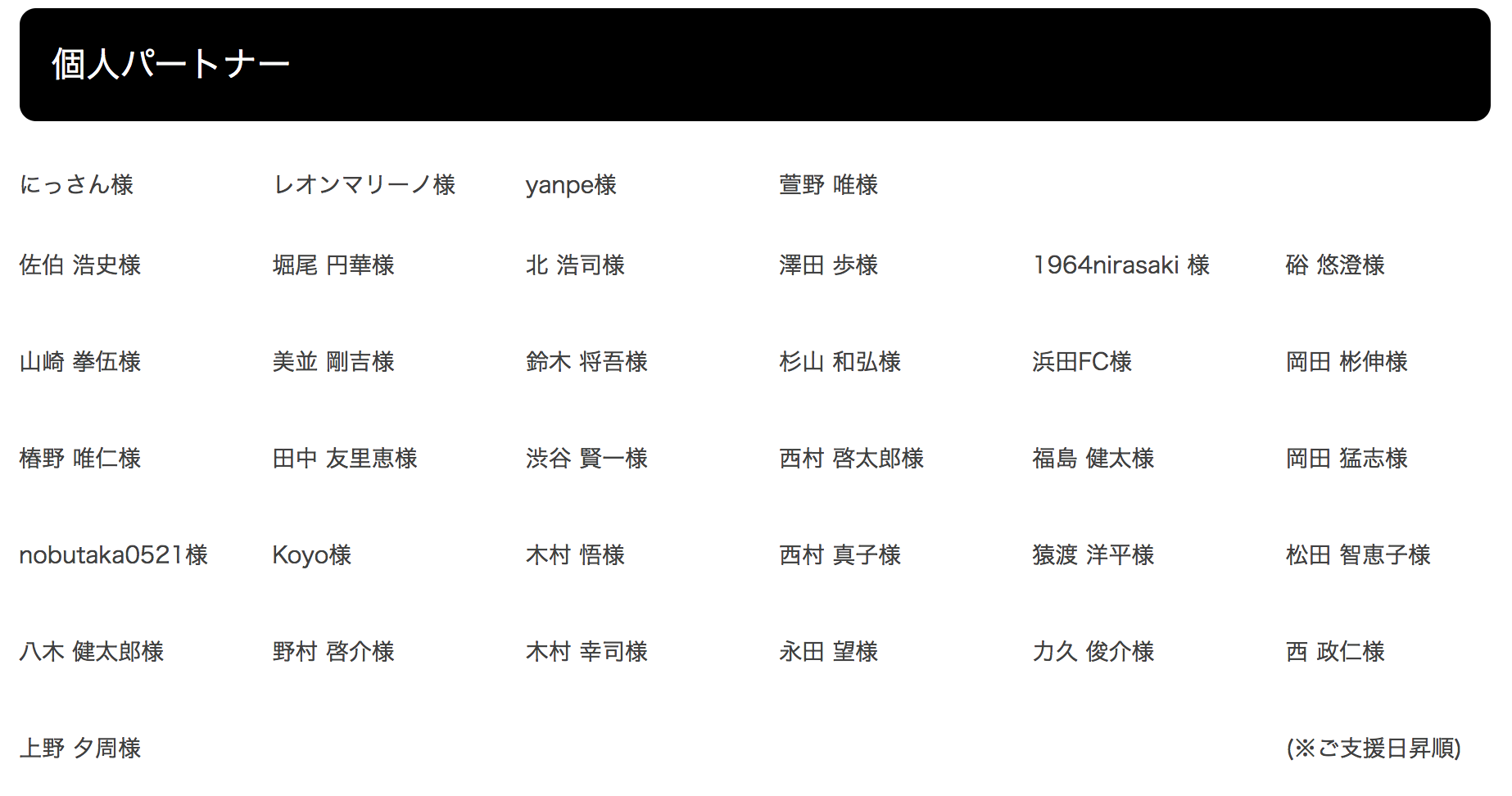 こちらは前回のプロジェクト【HP記載リターン】で支援して頂いた方々です。