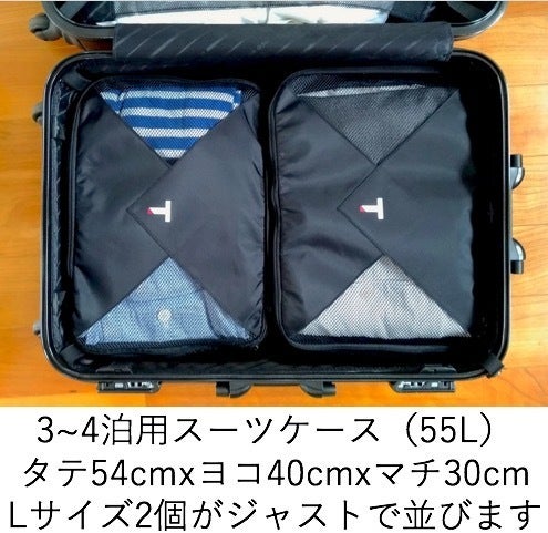 Lサイズは約36cm X 約26cm X 約10cmで、適合するスーツケースの目安は、3〜4泊以上の中型以上、50L以上になります。