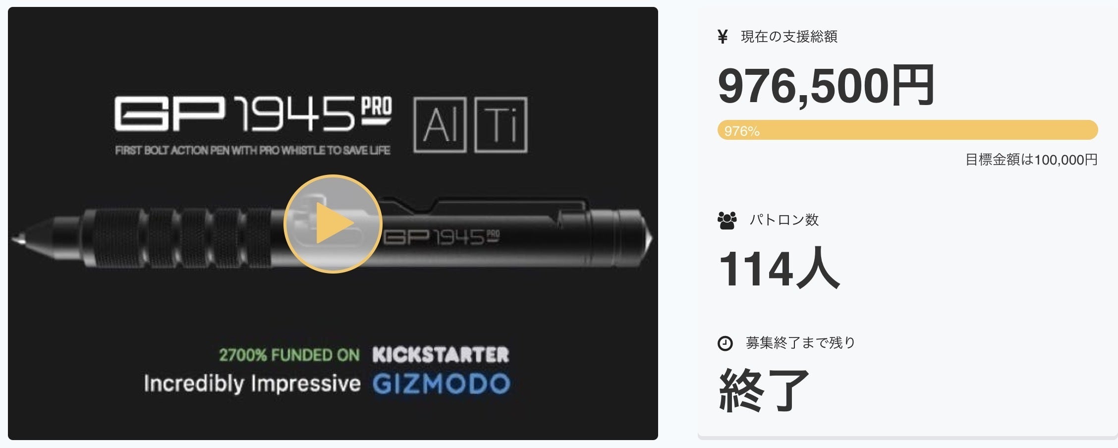 パトロンの皆様!ご支援ありがとうございます!! キャンペーン期間が残り10日となりました。 おかげさまで85名のパトロンのみなさまと出会うことができ、720%の達成率となっています!ありがとうございます。 残りわずかの期間ですが、国内で最もお得に入手できるチャンスが残っています! 圧倒的な存在感のチタン製 GP1945、新ラインナップのGP1945 LITE、そしてGP Clip。 この機会をお見逃しなく! ページのアニメーションの一部が動かなかった不具合が解消されました。耐水性、ガラスの破壊っぷりが見れますので、ぜひ見に来てください! SNSでのシェアで応援をいただけましたら嬉しい限りです。 最後までよろしくおねがいします!!