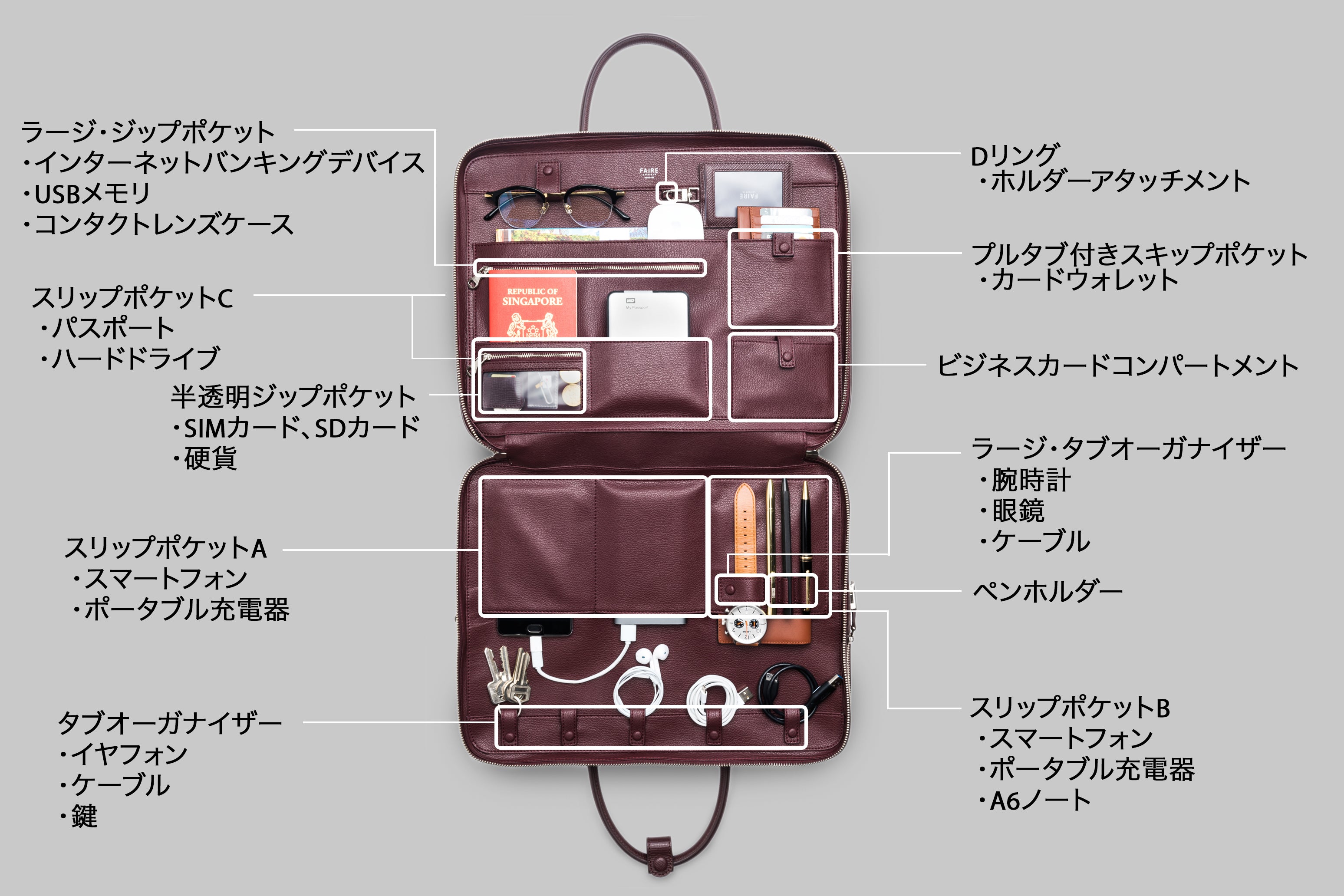 「FAIRE」ブリーフケースとスリムクラッチに共通する主な機能