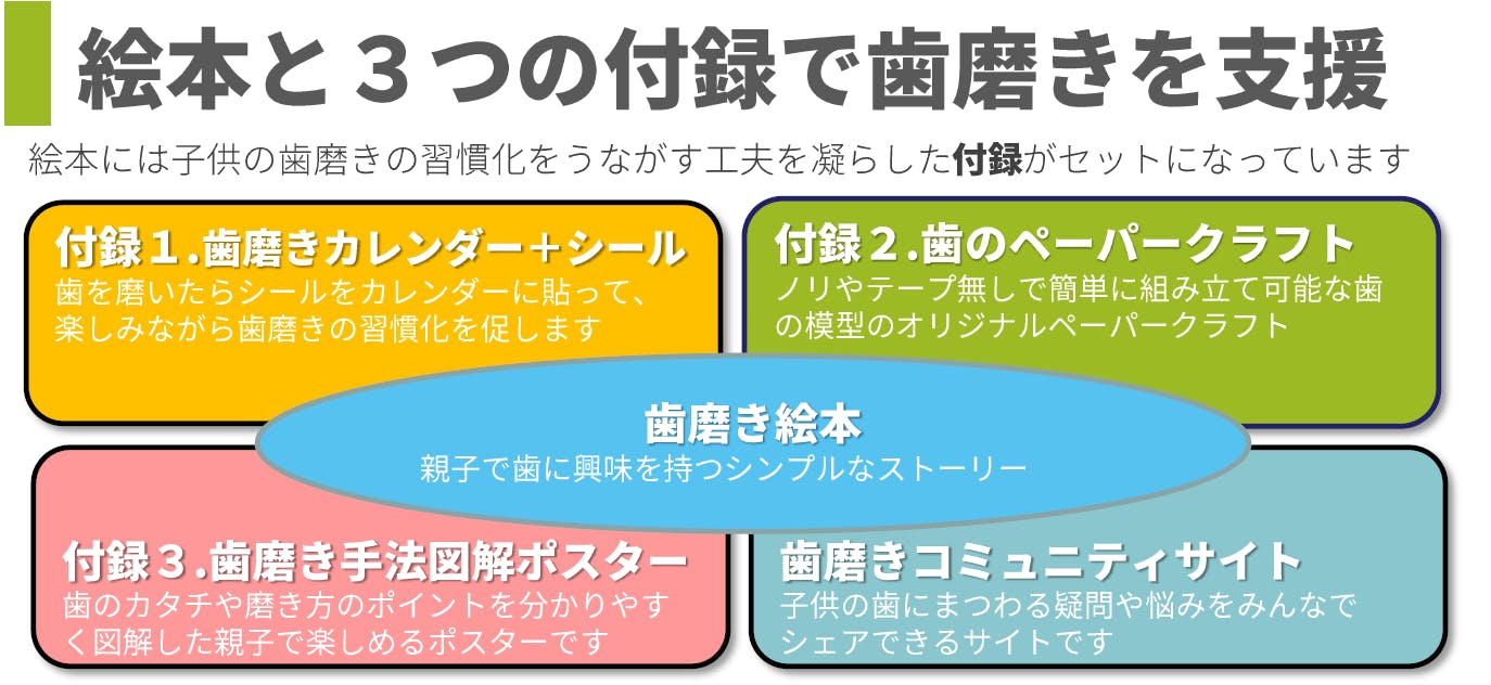 「はみがきあーん」は、絵本と4つの仕組みを合わせた「5つの仕組み」で子供の歯磨きの習慣付けをサポートします。リターンでは、「1.歯磨き絵本」「2.歯磨きカレンダー+シール」「3.歯のペーパークラフト」「4.歯磨き手法図解ポスター」の4点をセットにしてお届けします。