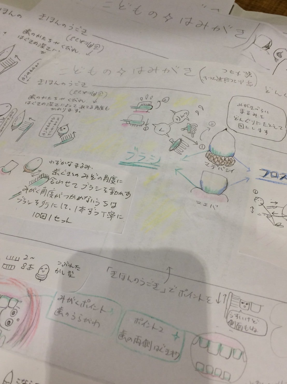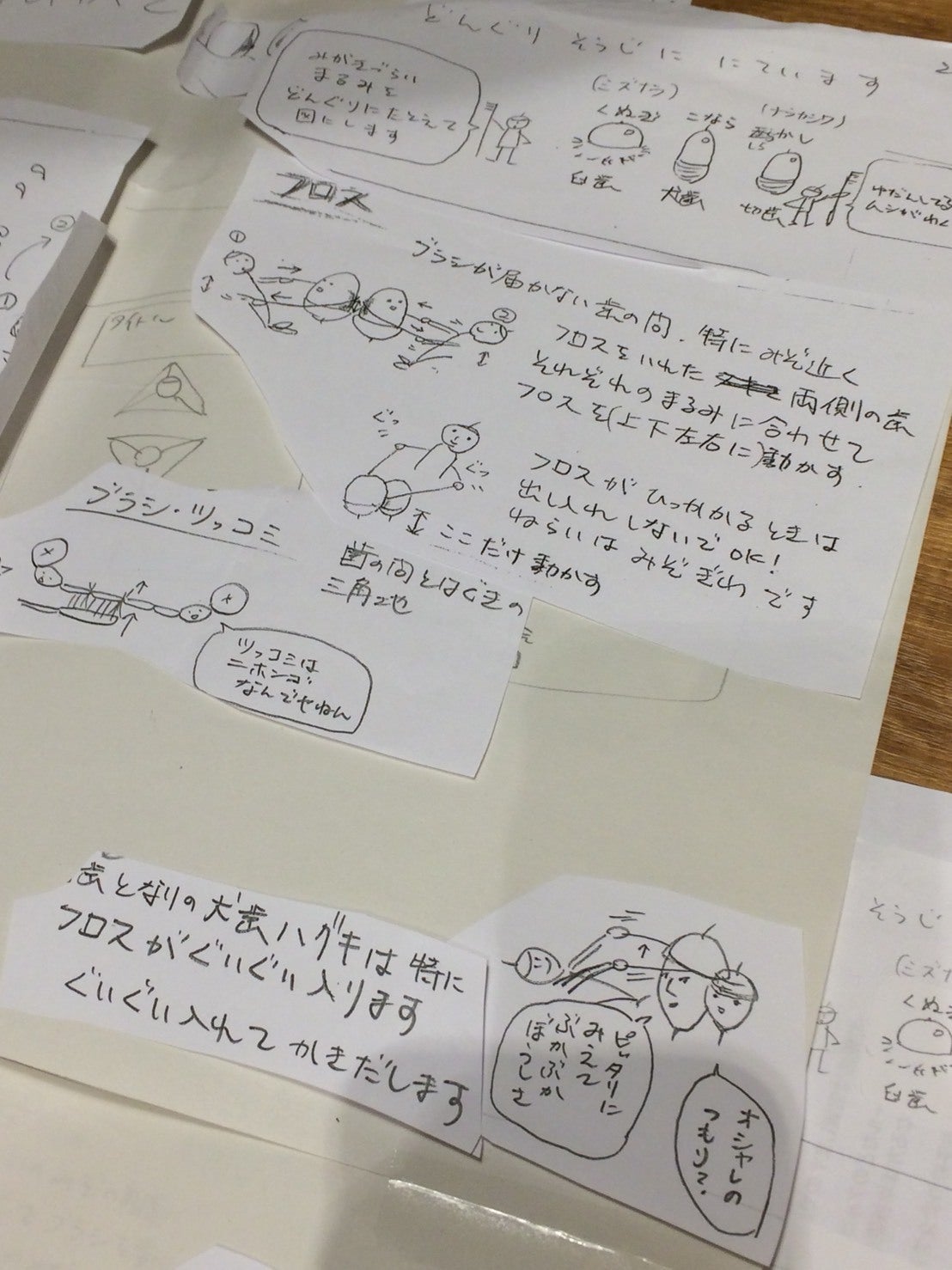 歯科医師の監修のもと、絵本に精通している図書館司書と何度も議論して、シナリオを作成しました。シナリオの作成過程の一部はこちらでご紹介しています。そして完成したシナリオを動画にしました。すべてのページは中村 綾花さんのイラストで作成されます。