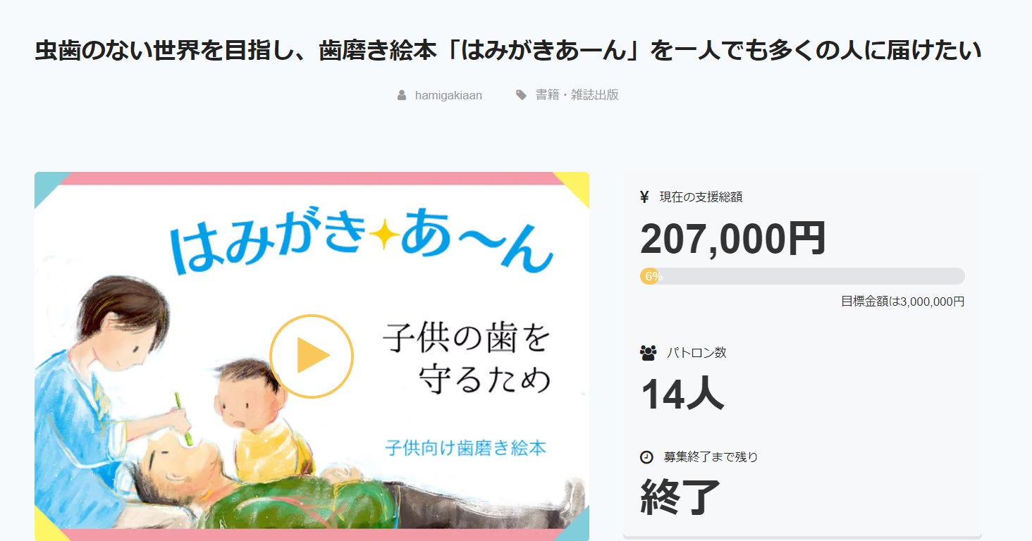 2018/11/19 00:36クラウドファンディング期間が終了しました。最終的な結果は、FAAVO 達成率100% ご支援者数78人 ご支援金額1,008,500円CAMPFIRE 達成率6% ご支援者数14人 ご支援金額207,000円ご支援総額:1,215,500円となりました!みなさまのご支援のおかげで、なんとFAAVOでは100%を達成することができました!!本当にありがとうございます。これより、よりよい絵本をみなさまにいちはやくお届けできるように邁進いたします。引き続きご支援のほど、よろしくお願いいたします。はみがきあーんプロジェクト一同 もっと見る