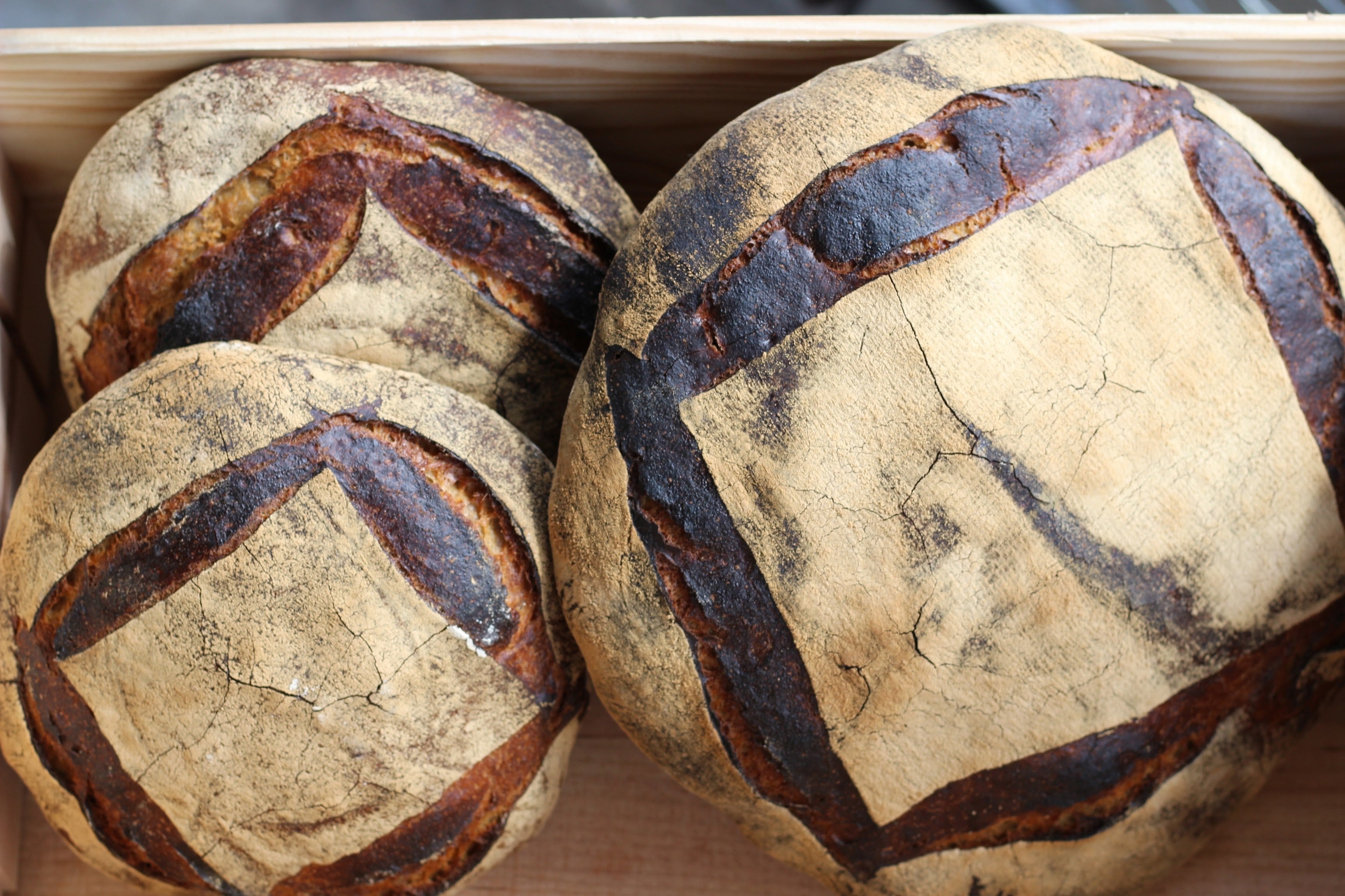 意識しているのは“どっしりとした美味しさ”です。趣向的な美味しさではなく深く優しく日々の食卓に寄り添うような、そんな美味しさです。使う小麦は交流のある農家さんから、麦のまま送っていただいたものを、その都度必要な量だけ石臼で挽いてパンに使います。小麦以外の材料も安全で安心して子供達に食べてもらえるものを選んでいます。薪窯の利点を最大限に生かすように、パンの大きさも一つが500g?1kgと大きいです。なので当日に食べきれるパン、というよりも、翌日、翌々日の方が美味しく食べてもらえるようにと思って作っていきます。種類も少ないのですが、明日、明後日、その先の未来を考えたら、その時に食卓にあるパンは、それほど多くの種類が無くてもいいんじゃないか、と考えています。