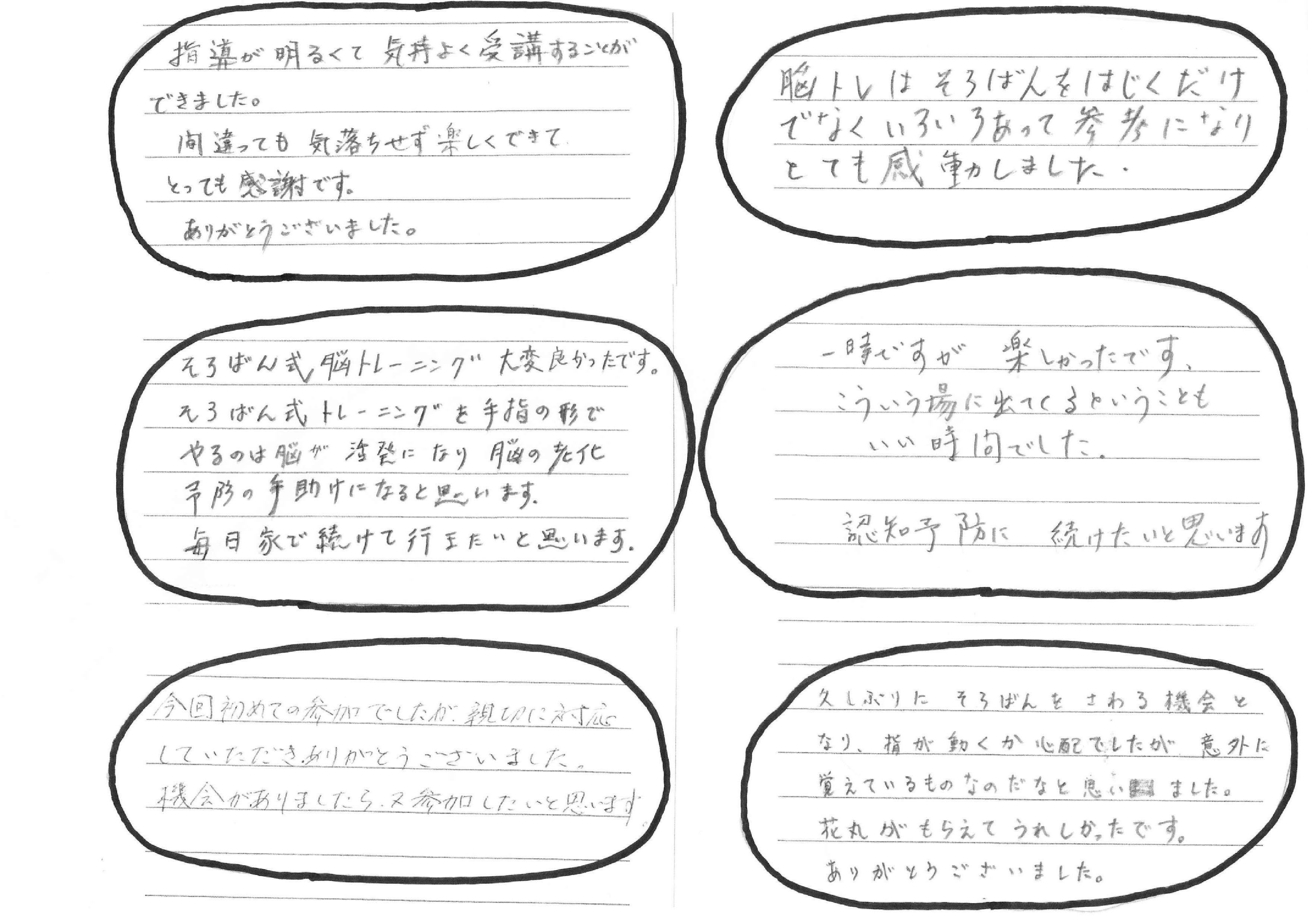 ②そろばん式脳トレーニング大変良かったです。そろばん式トレーニングを手指の形でやるのは脳が活発になり、脳の老化予防の手助けになると思います。毎日家で続けていきたいと思います。