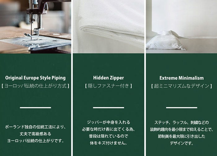 EVOLONの素材の掛布団カーバです。体に傷がつかないように隠しファスナーを使用、ミニマリズムなデザインやヨーロッパ伝統の仕上がり方法で制作したので機能性もデザイン性も満足度が高い製品です。