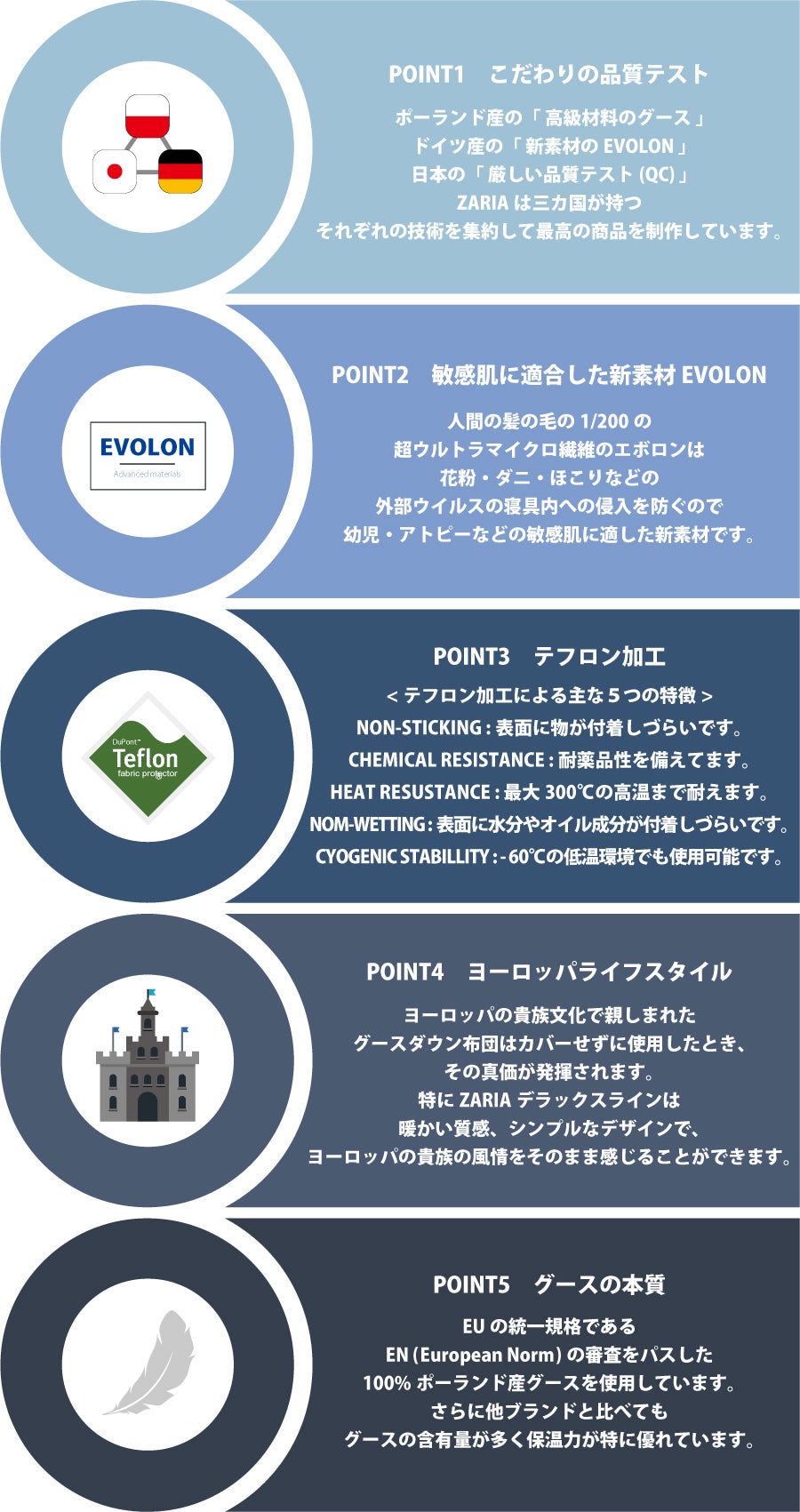 その結果、ZARIAはドイツ新素材「EVOLON(エボロン)」が使われたカバー、中身は100%ポランド産グースを使用したアンチウィルスグース寝具を作ることに成功しました。