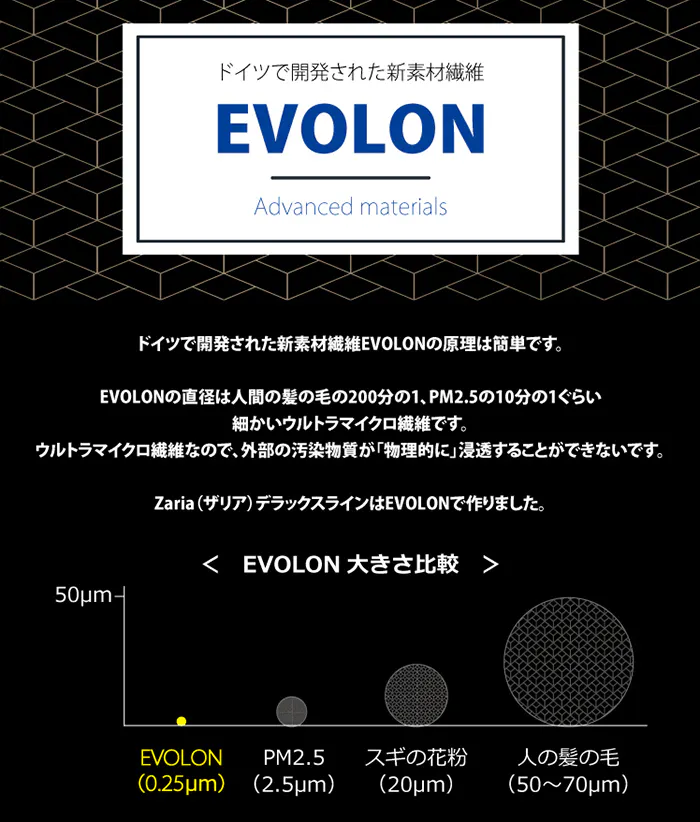 1.ZARIAは汚染物質をカットするEVOLON素材を選びました。