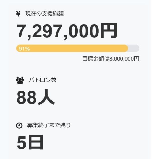 今日はパトロン数88人と昨日の88%に引き続き2日連続で末広がりで縁起のよい数の方々からご支援をいただきました。