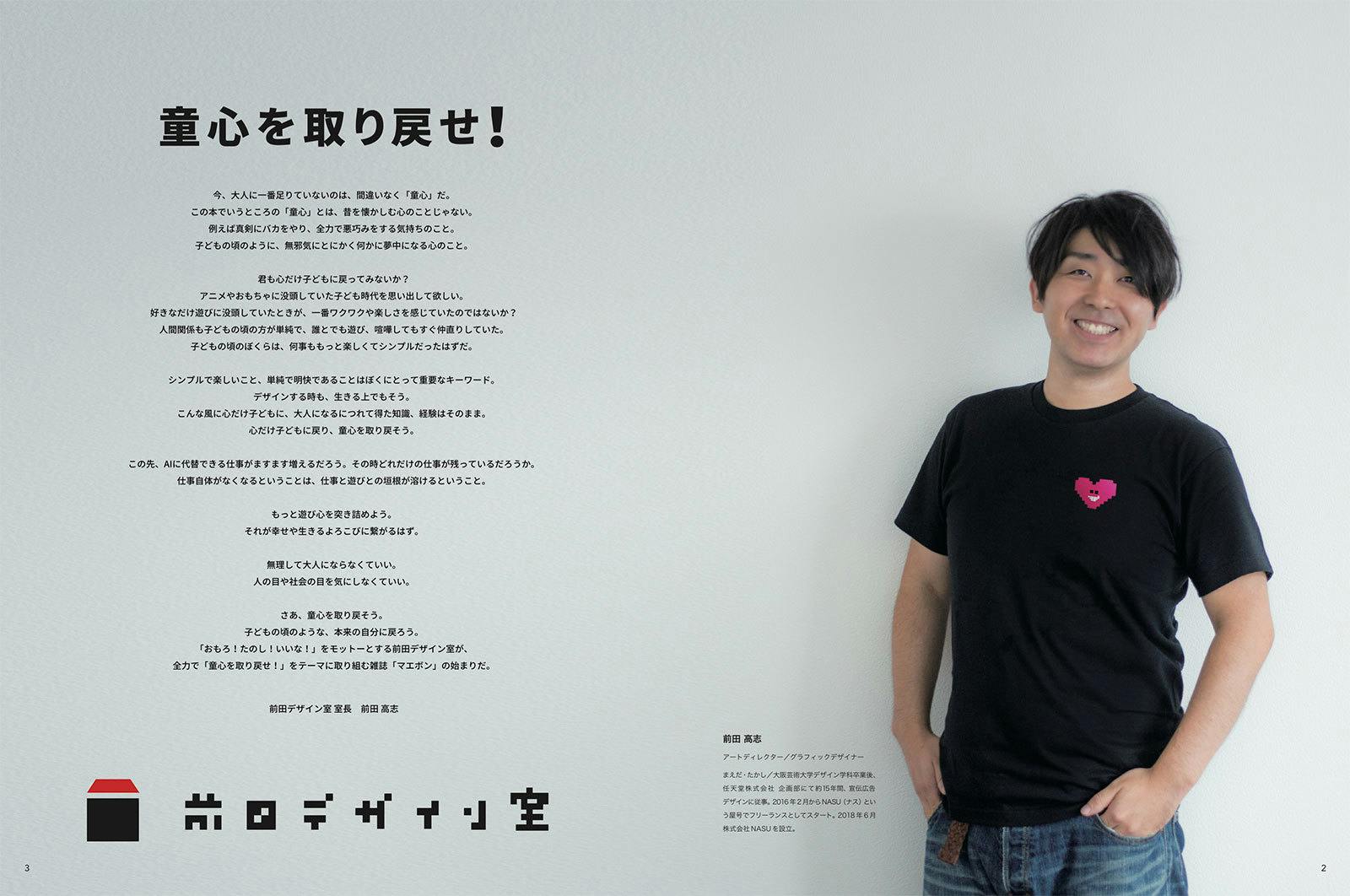 「おもろ!たのし!いいな!」をモットーとする前田デザイン室が、全力で「童心を取り戻せ」をテーマに取り組む雑誌「マエボン」の始まりだ。