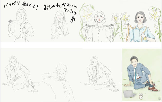 前田デザイン室クリエイターの斉藤ナミ(パン子)です。 今回私は、マエボンの雑誌制作TADOT CARDの53~55Pとクラウドファンディングのリターン、似顔絵制作の特典で参加しました。 今日は、私がパトロン様に制作した似顔絵の制作過程をお届けします。 一人目:あかねさん まずお一人目に、前田デザイン室のクリエイター、あかねさんです。 なんと、あの童心くんのぬいぐるみを作ったアパレルデザイナーさんです! どんなイラストがいいかご希望をうかがうと、「アパレルデザイナー感のあるもの」という事でした。 アパレルデザイナーって? と検索すると出てきたのが、トルソーや服を作る人たちの画像。みんな一様に手にしているのが、洋裁用のメジャー。そして、手首には、待ち針を指すクッションみたいなもの。 そうか!!アパレルデザイナーってこういうかんじね??と、提案したラフ案が、こちら。 このあと、最新のお写真を拝見して、髪型を変更、やまゆりがお好き、という事で、デキバエ60%の提示がこちら。 そして、最終的に修正したものが、こちらです。 吉田羊さん似の、とっても美しいあかねさん。(ご本人は、ラッセンが好きな永野似だよ〜と、謙遜してる。) 納品後、さっそくTwitterのアイコンにもしていただけて、「お気に入り」と 喜んで頂けました^_^ 本当に楽しかったです!あかねさん、ありがとうございます。 二人目:大山さん お二人目が、システムエンジニアの大山さんです。 数枚お写真をもらったところで、どんな感じがいいか伺ったところ、なんと! 「パン子さんの自由に!」というお答えが!! なんということでしょう? 実は、今まで男性は「自由に」描いた事がなかった為、テンションぶち上げですw そこでわたしは「ス、スーツを着てる男性がめっちゃ好きなんですけど…」と、キモい返答をしたところ…、さわやかに「いいですよ!じゃあそれで」と、快諾!! やったー!!!意気揚々と提案したラフ案がこちら。 ここで、ラフからの選定なのですが、 この時も大山さんは「パン子さんが一番ワクワクするのはどれですか?」 と、またもわたしのワクワクを優先してくださり、もうテンションはマックスですww 次々あふれる変態ワールドへの妄想…、(鼻息荒い状態で大山さんに説明しながら描いていきました) 会社の同僚(同僚以上恋人未満)と、ランチタイムに外へ出るわたし…、 ビルの外の移動ワゴンのサンドイッチ屋さんで、ホットドッグとコーヒー(彼はブラック、わたしはラテ)を買い、近くの公園へ…、 芝生へ腰を下ろし、ジャケットのボタンを外し、腕まくりする彼…、 (筋張った肘下にうっとり…) そして、ネクタイを緩めて、第一ボタンもはずす彼…、 仕事はバリバリできる彼、仕事中に見せる責任感のある隙のない姿とはうって変わって、リラックスしまくりの表情と、けだるいその姿…、 もうっ…わたし以外の女にも見せたりするの?その表情っ!! ドキドキ!! できあがったのが、こちらです。 題して「けだるさ萌え、スーツ男子」です。 大山さんも、一切気持ち悪がることもなく、笑いながら受け止めてくださり(さすが童心の持ち主!) 始終ニヤニヤしながら、とっても楽しく描く事ができました。 大山さん、ありがとうございました^^ 残りお二人のイラストを描くのも、今から、とっても楽しみです。 絵を描いている時が、一番楽しい!! 今回、わたしの似顔絵付きのマエボンにご支援いただいた、あかねさん、大山さん、これから描かせていただく二名の方、本当にありがとうございました。 <クリエイター紹介> 前田デザイン室 斎藤ナミ(パン子) 愛知県の看板屋さん「看タロー」経営。(看板、ロゴ、カーラッピング、メニュー、パンフ、名刺、グッズ、店内装飾、なんでもやります)デザイン、イラスト。#前田デザイン室 //新しい時代の資産運用→ #マネクラ // 高橋一生の肉親になりたい。ゲーム好き。読書好き。ファッション好き。器用貧乏。 感情駄々漏れお母さん。