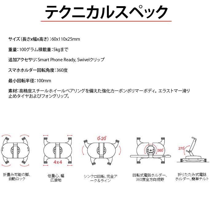 折りたたみ式電話ホルダーと特許出願中の回転式の脚を使用すると、MUWI1つで直線や曲線で安定した動きを実現できるツールになります。