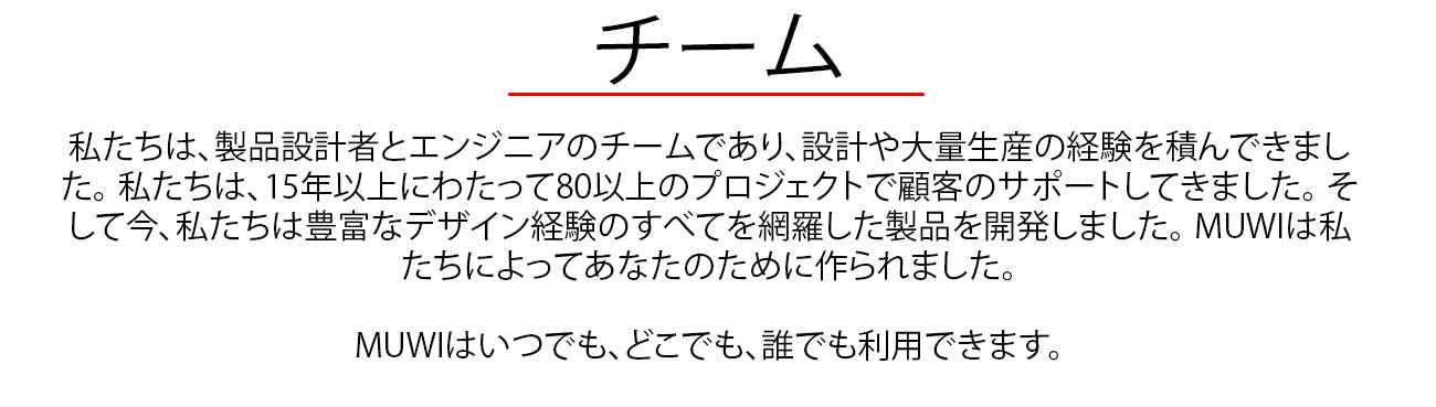我々は、製品開発プロセスにおける準備方法や、いかなる段階においても問題が発生する可能性があり、それに対処する方法もよく理解しています。 それでも完璧な事業計画を立てました。 デザイン、試作、そしてテスト、幾度もの反復の後、MUWIが完成しました。 これに加えて我々は10年以上にわたり協力してきたサプライヤーとベンダーを持っています。