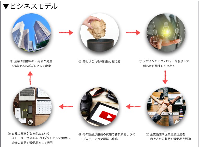 具体的には、クライアントとなる企業や団体から排出されるゴミを素材と見なし、そのクライアントの営業ノベルティーなどの販促品として、再度クライアントに納めるというフローを構築したいと考えています。