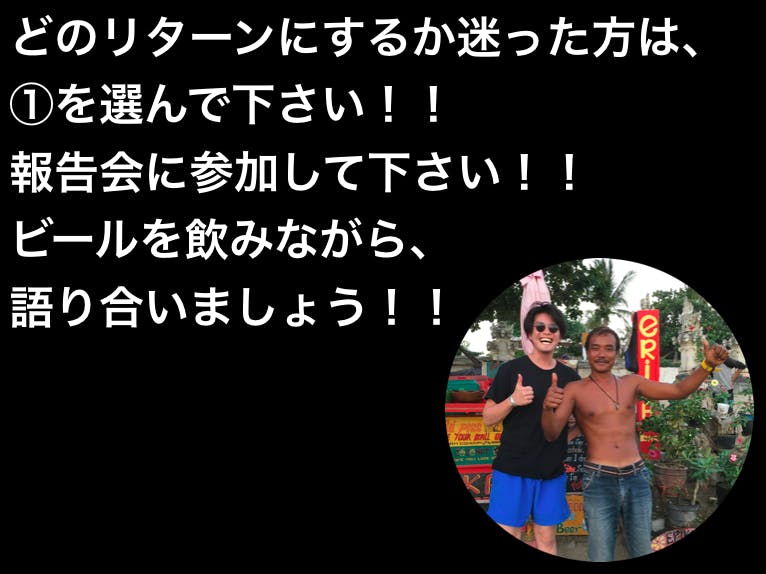 ①【10,000円】報告会の招待券 ※ 東京開催、2019年9月下旬開催予定(イベントスペースを貸し切って、市場調査や海外生活について、写真や動画を交えて報告会を開催します。当日は缶ビールや缶ハイボール等を山ほど準備しますので、飲みながら、環境や海外、参加者の方のビジネスについてなど語り合いましょう!)※当日参加できない方には、報告会のまとめムービーをお送りします。※現地までの交通費はご負担下さい。