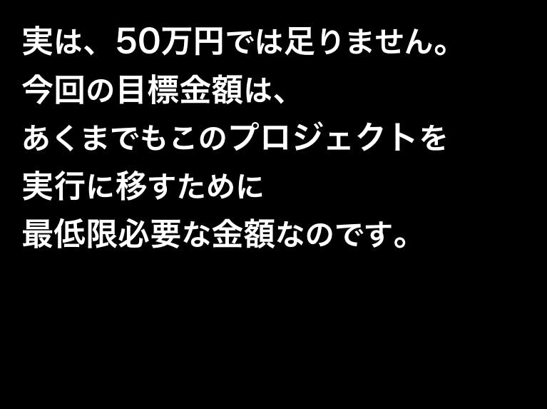 50万円以上集めることができれば、サンプル購入等も積極的に行えるので、目標金額の50万円はあくまでもプロジェクトの実施に最低限必要な金額として設定しています。