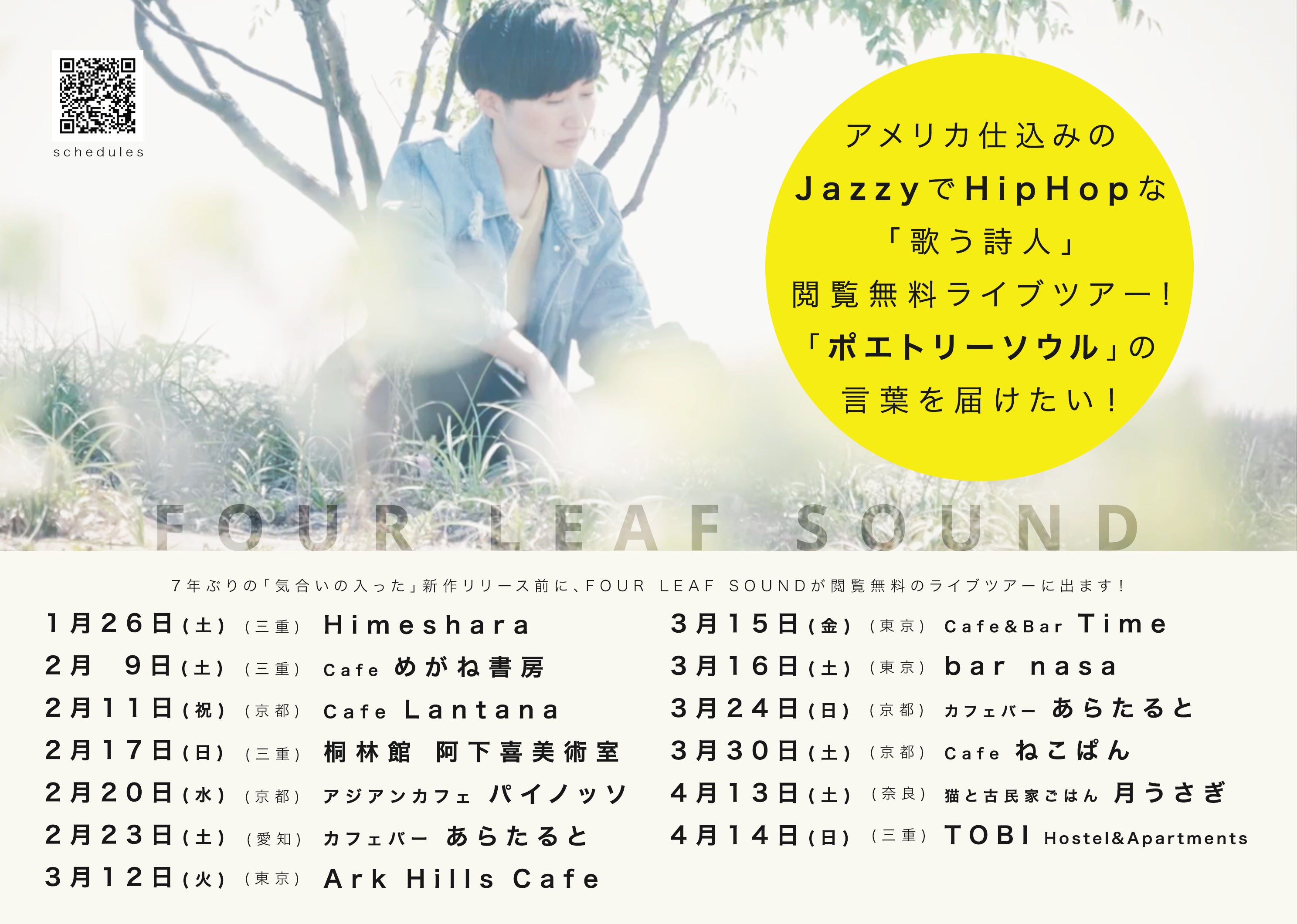 昨年の秋から、いろいろと打診したり、検討してもらったりしてましたが、これで、今ツアーの日程全てになります!すでに終わったところもありますが、引き続きFOUR LEAF SOUNDのポエトリーソウルを最善でお届けできるように頑張ります。地域別の日程はこちら。関西方面もこの連休から始まります。全て郊外や車じゃないと行けないところなのですが。。東京は3箇所。それぞれ雰囲気が全然違う空間なので、お好きなところに遊びにいらしてください〜♪日程の詳細はこちらでご確認ください。みなさんにお会いできるのを楽しみにしています!